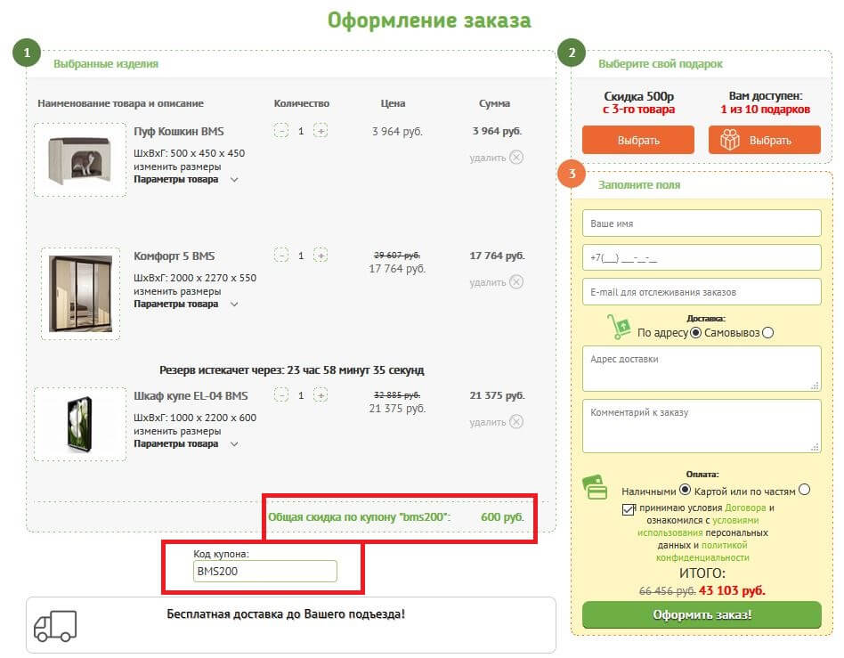 - Купон необходимо ввести в поле "Код купона" в корзине при оформлении заказа.