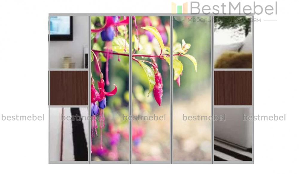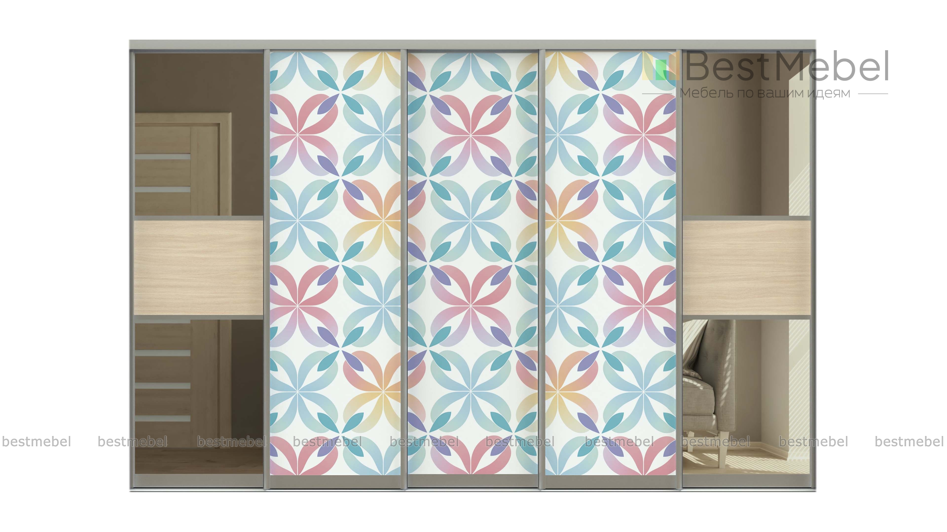 Двери-купе Глазго 2 BMS гармонично вписываются в пространство современной квартиры. Три створки с пастельным орнаментом-фотопечатью в центре дополнены боковыми полотнами, в которых чередуются древесные вставки из ламинированной плиты и зеркала. Пятидверный раздвижной фасад подойдет как для вместительного шкафа, так и для гардеробной в спальне или прихожей. Купить двери-купе Глазго 2 BMS с индивидуальным подбором размеров, цвета и фурнитуры можно на нашем сайте.