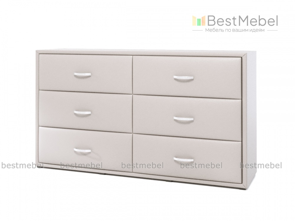 Комод Камалия 2 BMS – горизонтальная модель с двумя рядами выдвижных ящиков, которая станет практичным дополнением спального гарнитура. Комод позволит компактно разместить постельные принадлежности, одежду, аксессуары и декоративные мелочи благодаря шести просторным отделениям. Украшением комнаты станут фасады в мягкой обивке из экокожи пастельных оттенков с удобными врезными ручками. Купить комод Камалия 2 BMS приглашаем в наш интернет-магазин, подобрав необходимые параметры.