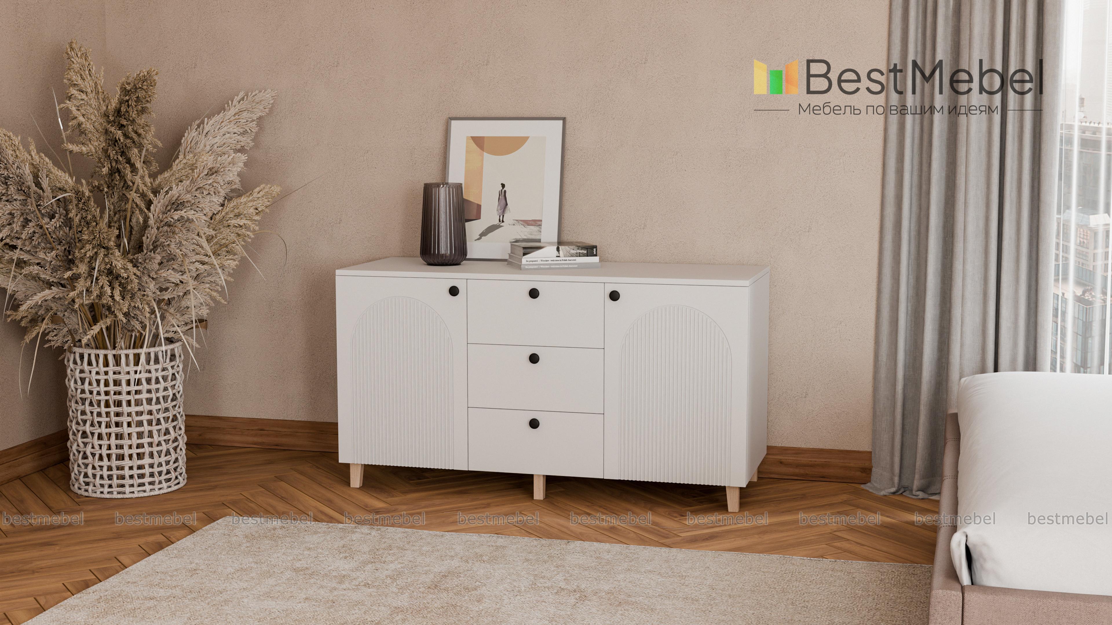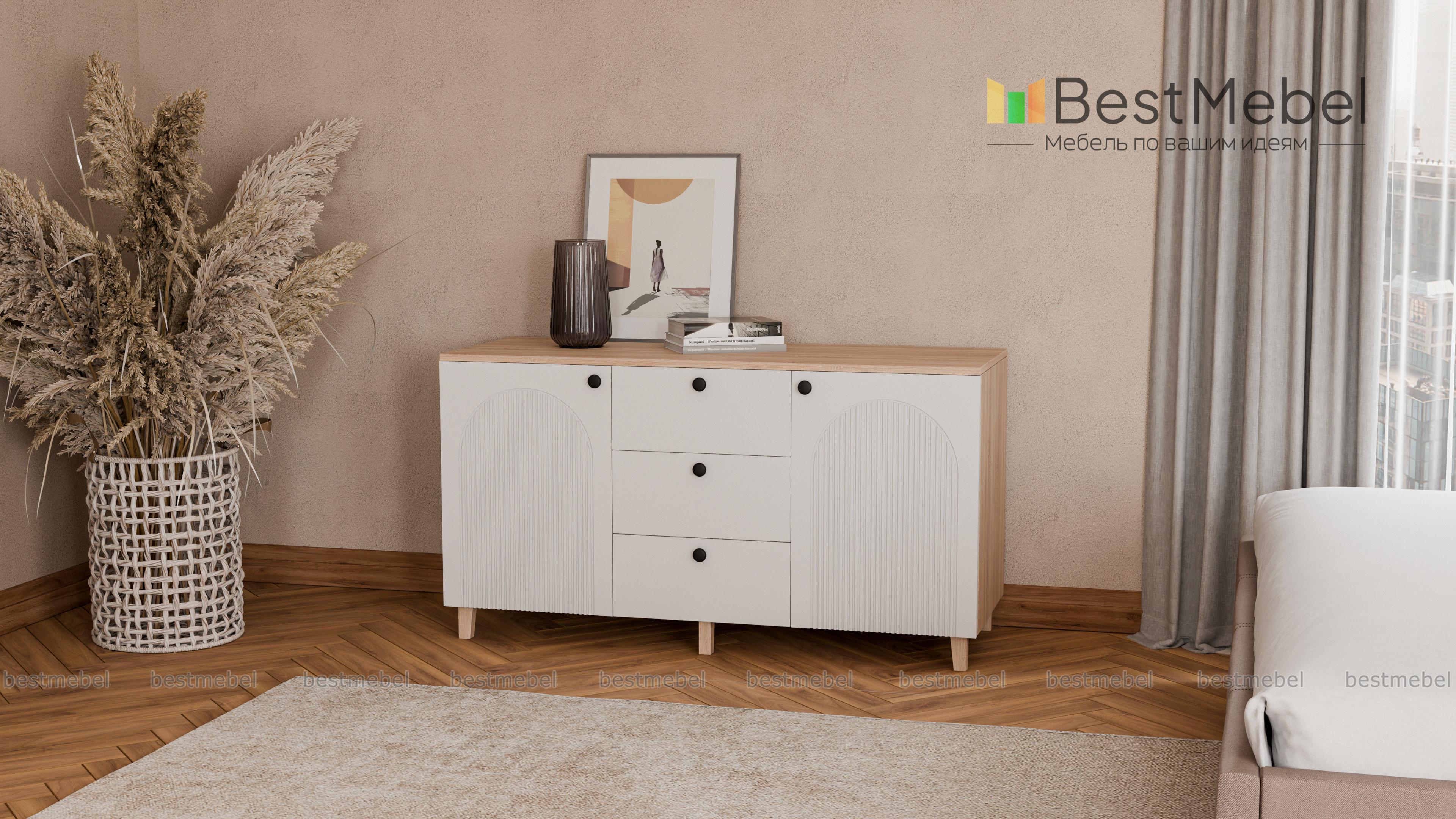 Комод Рене 1 BMS поможет сохранить порядок в комнате и добавит в интерьер стильные акценты. Под широкой столешницей, на которой эффектно смотрится декор, располагаются два распашных отделения с полками и ряд из трех вместительных выдвижных ящиков. В современном дизайне комода использована комбинация темного фактурного фасада и корпуса под древесный массив. Купить комод Рене 1 BMS приглашаем в наш интернет-магазин, подобрав размеры и цвет по своему вкусу.