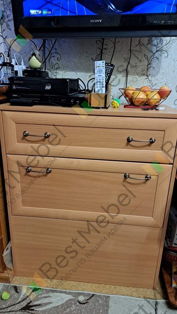 Отличный комод: вместительеый, удобный, красивого дизайна. Сборка немного напрягла: муж немного запутался в досках (инструкция непонятная, надо последовательные шаги указать, а не картинку в разрезе. Но самое загадочное - отсутствие дыр для ручек на откидной крышке. Пришлось высверливать для болтов. Затратно по времени вышло.