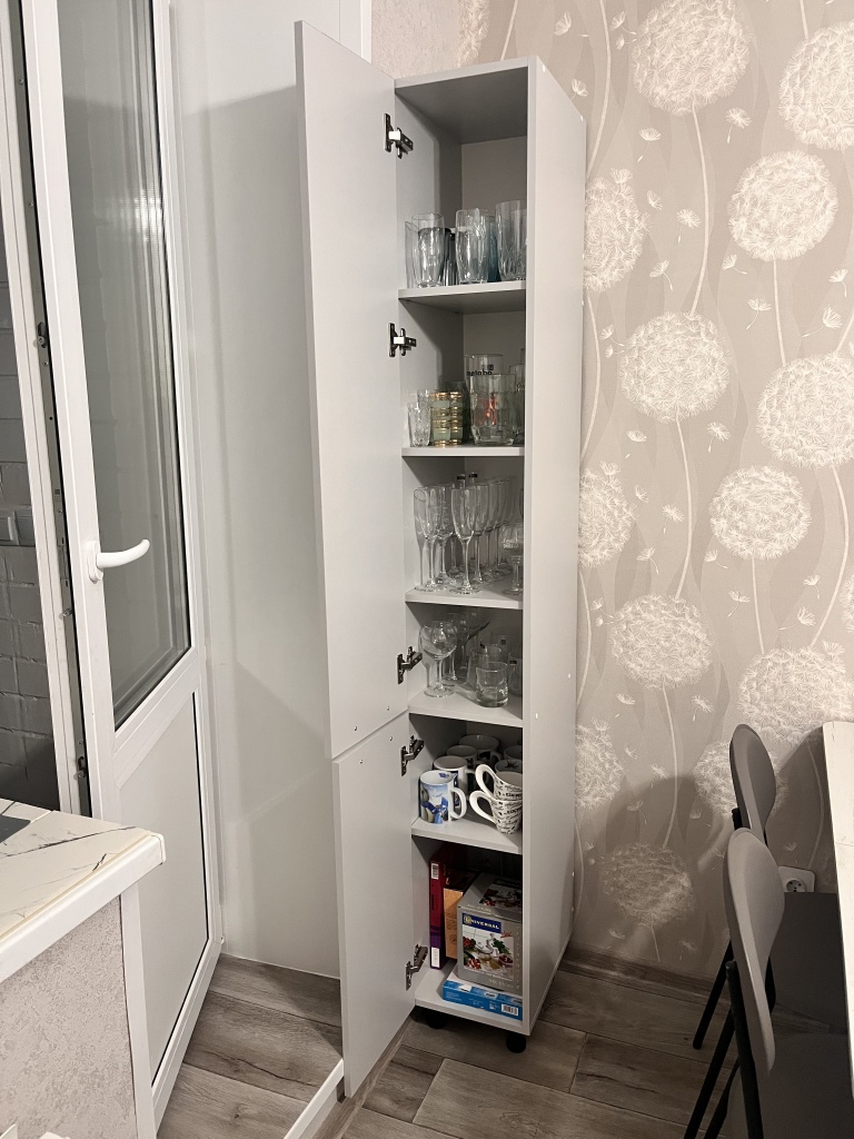 Отлично вписался на кухню, вмещает в себя много посуды, занимает мало места.