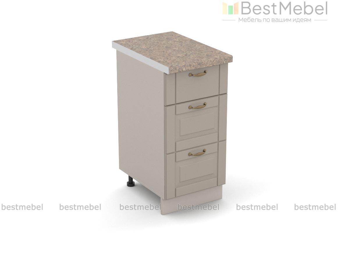 Тумба Клайд 1М 2Б BMS – функциональное дополнение нижнего ряда модульного гарнитура для кухни. Компактная по размеру, тумба оборудована тремя выдвижными ящиками – одним малым и двумя большими, и подходит для хранения столовых приборов, посуды, мелких кухонных аксессуаров. Гармонично вписаться в интерьер помогут фасады, выполненные в характерном для серии пастельном оттенке и декорированные классической фрезеровкой. Купить тумбу Клайд 1М 2Б BMS с учетом необходимых параметров вы сможете в нашем интернет-магазине.