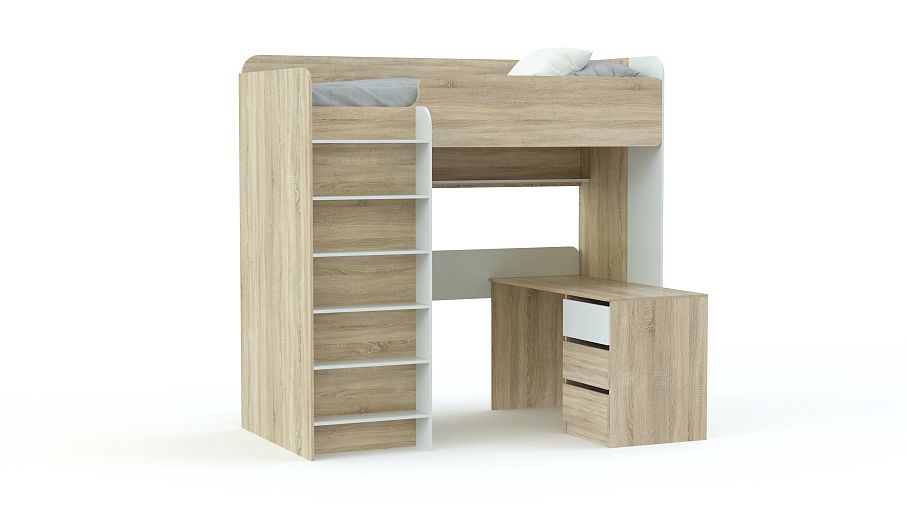Детская кровать-чердак Дм110 BMS – практичная модель для небольшой по площади комнаты ребенка. Здесь удачно реализована учебная зона и спальное место. Оно находится наверху, в целях безопасности оборудовано бортами. Лестница устойчивая, прочно крепится к каркасу. Под основанием расположен стол. Он оснащен отделениями для хранения (выдвижные ящики). Габариты столешницы подойдут младшему школьнику. Учебники и книги расставьте на полке. Привлекательная конструкция сделана из ЛДСП. Цвет материала подбирается под стиль интерьера и вкусы владельца.