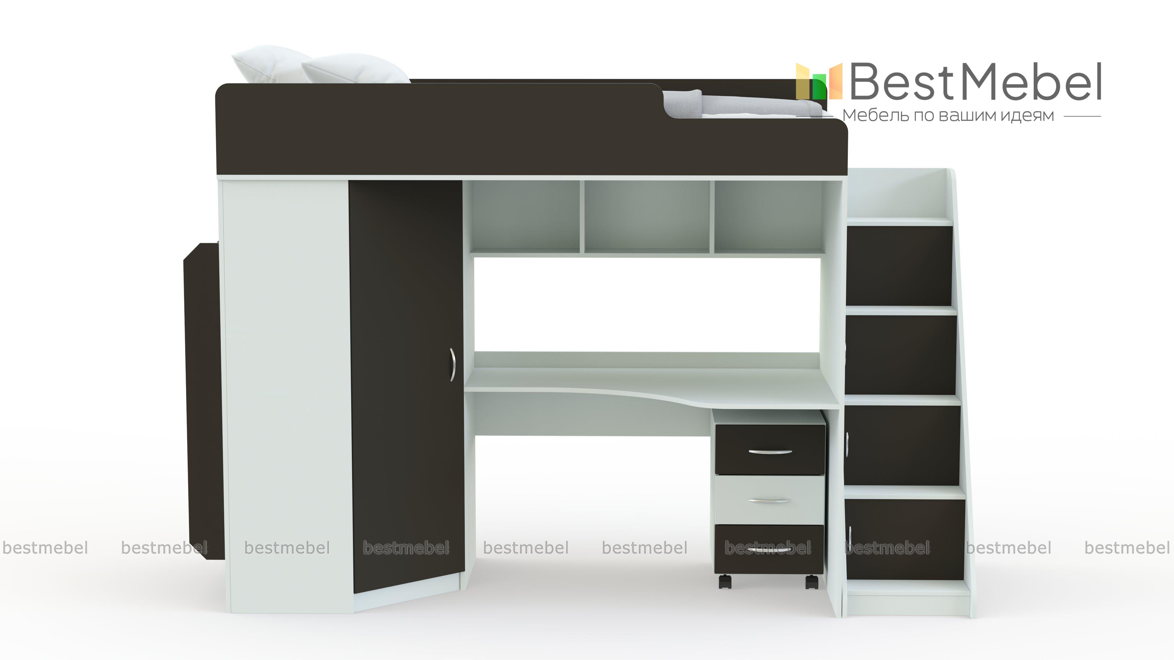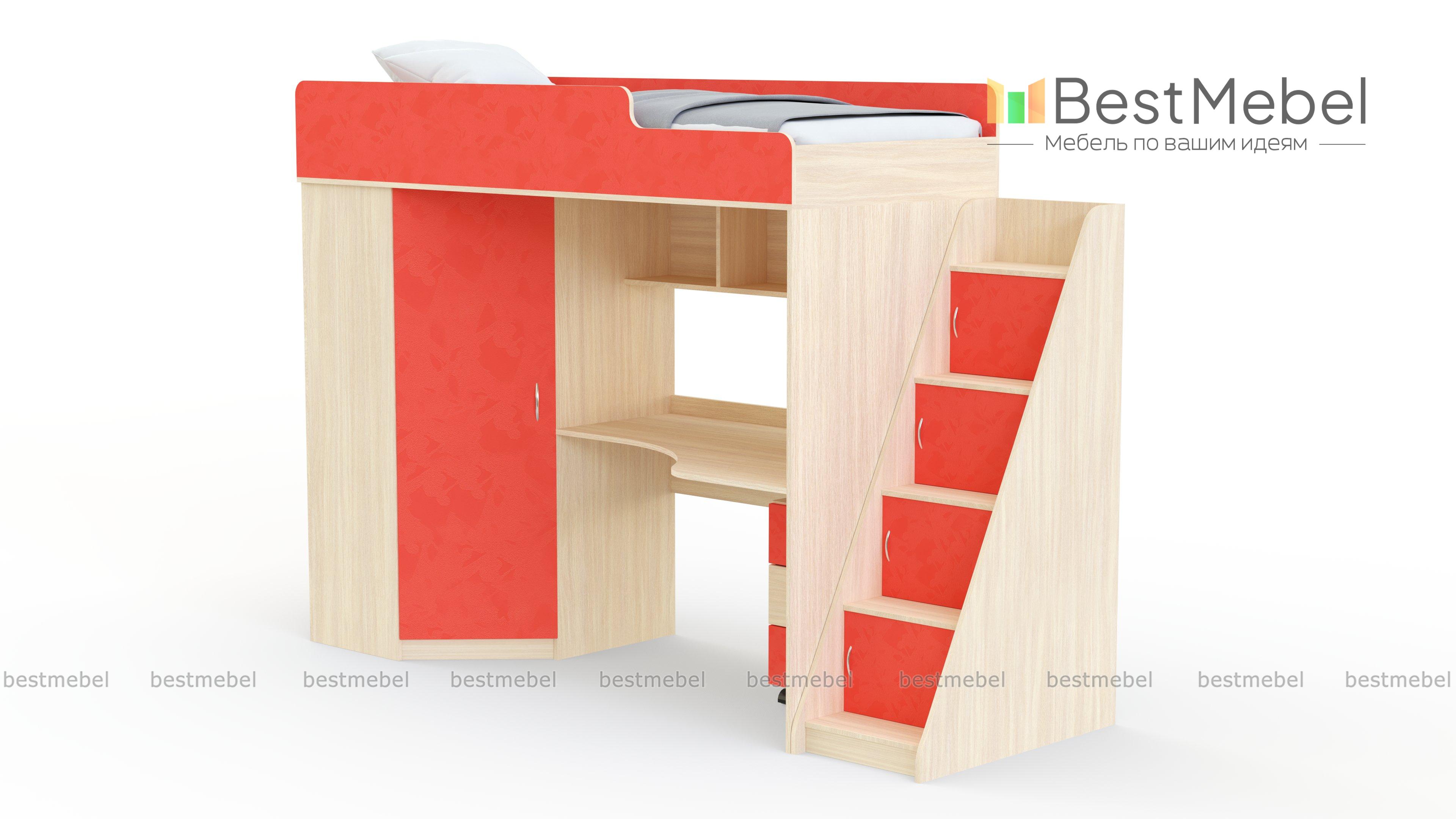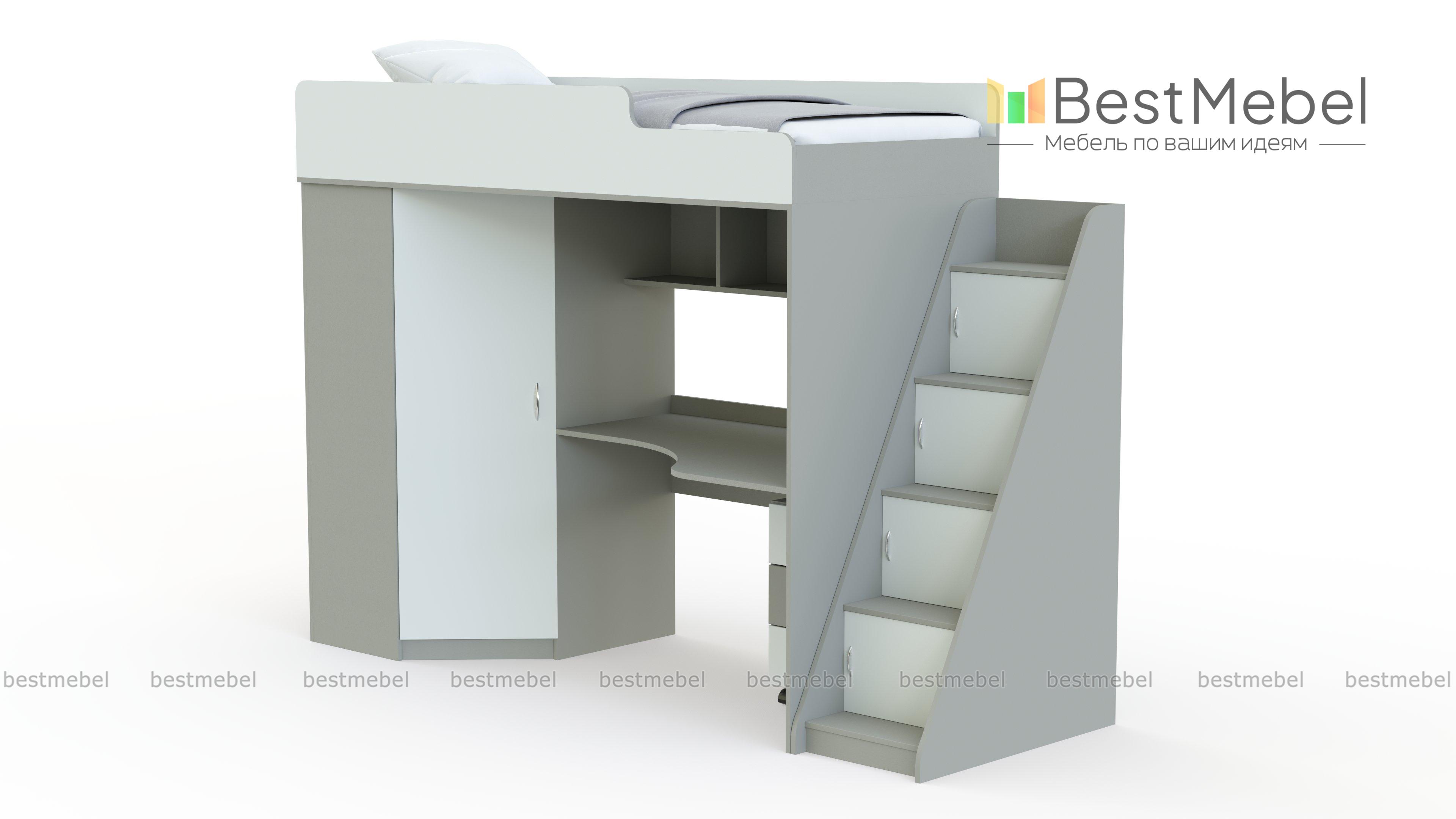 Детская кровать Миф 4.3 с полками BMS – это не только комфортное спальное место, но и эргономичная рабочая зона, и удобная система хранения. Продуманная до мелочей конструкция, включающая кровать-чердак, лестницу со стеллажом, встроенный шкаф, письменный столик, мобильную тумбу и открытые полки, поможет разместить одежду и игрушки ребенка, а также обеспечит его местом для учебы и творческих занятий. Все поверхности безопасно скруглены и обработаны защитной кромкой. Купить детскую кровать Миф 4.3 с полками BMS приглашаем в наш интернет-магазин.
