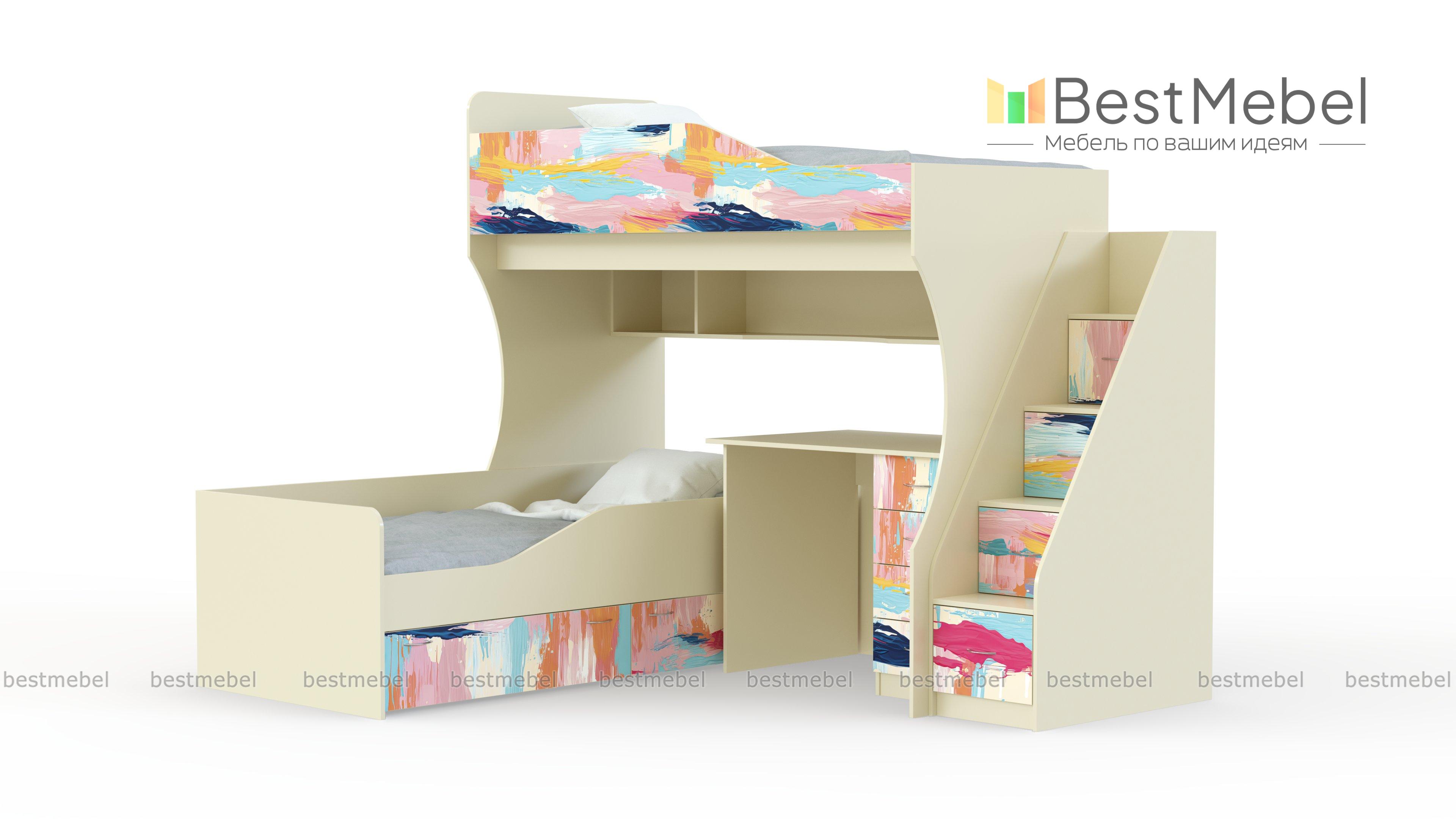 Двухъярусная кровать Дуэмо 5.1 BMS поможет рационально организовать пространство и освободить центральную часть детской для игр или спортивных занятий. Композиция состоит из двух расположенных перпендикулярно спальных мест, приставной лестницы-комода и рабочей зоны со столом, тумбой и книжными полками. Для хранения постельных принадлежностей в основании нижней кровати предусмотрены выдвижные ящики. Купить двухъярусную кровать Дуэмо 5.1 BMS приглашаем в наш интернет-магазин, подобрав оптимальное цветовое решение.