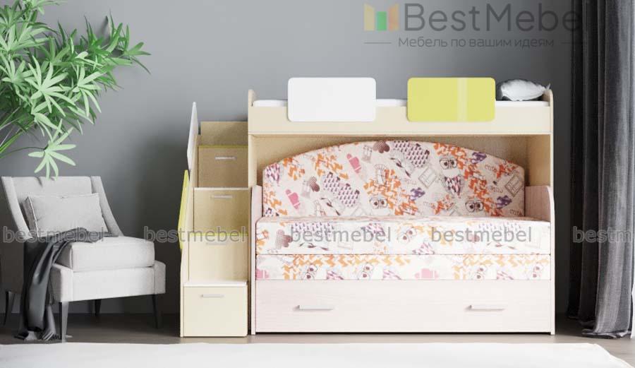 Кровать-чердак с диваном Пума 5 BMS – это комфортная зона отдыха и удобная система хранения. На верхнем ярусе располагается просторное спальное место с фигурным бортиком, а в нише на первом – уютный диван. Легко забраться в кровать и разместить книги и игрушки поможет ребенку лестница-комод с широкими ступеньками, вместительными ящиками и торцевыми нишами. Купить кровать-чердак с диваном Пума 5 BMS для меблировки современной детской вы сможете в нашем интернет-магазине.