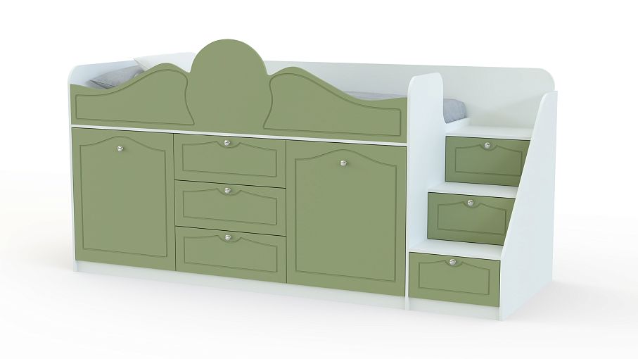 Кровать-чердак Стриж-1 BMS выполнена в классическом стиле и украшена по фасаду фрезеровкой. Элегантная композиция в нежных светлых тонах станет прекрасным выбором для спальни девочки. На втором ярусе располагается уютное спальное место с фигурно вырезанным бортиком, а на первом – лестница-комод, выдвижные ящики и шкафчик для одежды и постельного белья, а также скрытый в нише выкатной столик. Купить кровать-чердак Стриж-1 BMS и эффективно использовать пространство вам поможет наш интернет-магазин.