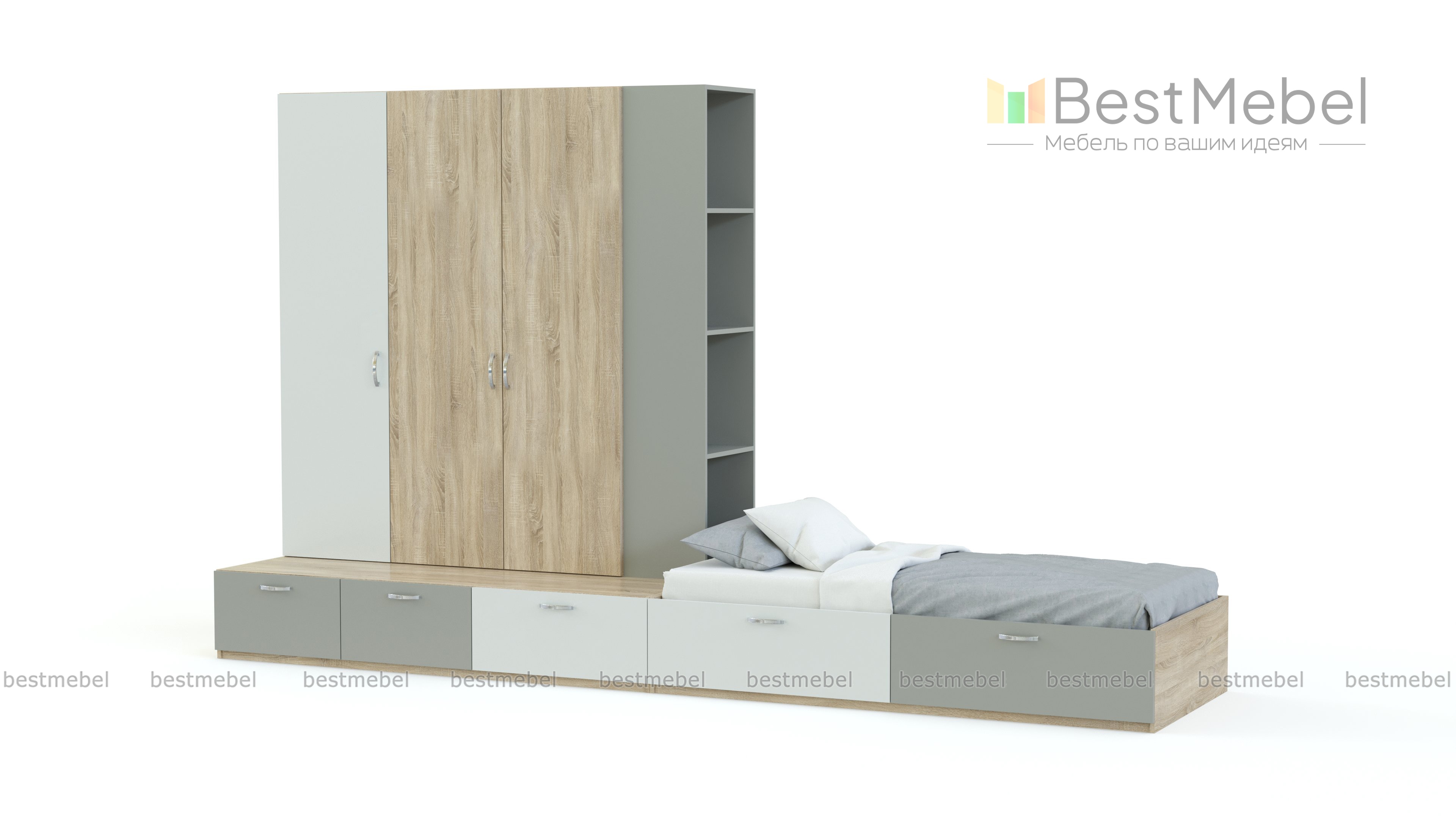 Кровать со шкафом Сказка 21 BMS станет отличным решением для небольших и узких комнат, помогая рационально организовать пространство. Композиция объединила кровать и расположенный на подиуме трехдверный шкаф с платяным отделением, бельевыми полками и торцевым книжным стеллажом. Расположенные в основании кровати и подиуме выдвижные ящики удобны для хранения постельных принадлежностей и игрушек. Купить кровать со шкафом Сказка 21 BMS, выполненную в сочетании древесных тонов и белого с яркими акцентами, приглашаем в наш интернет-магазин.