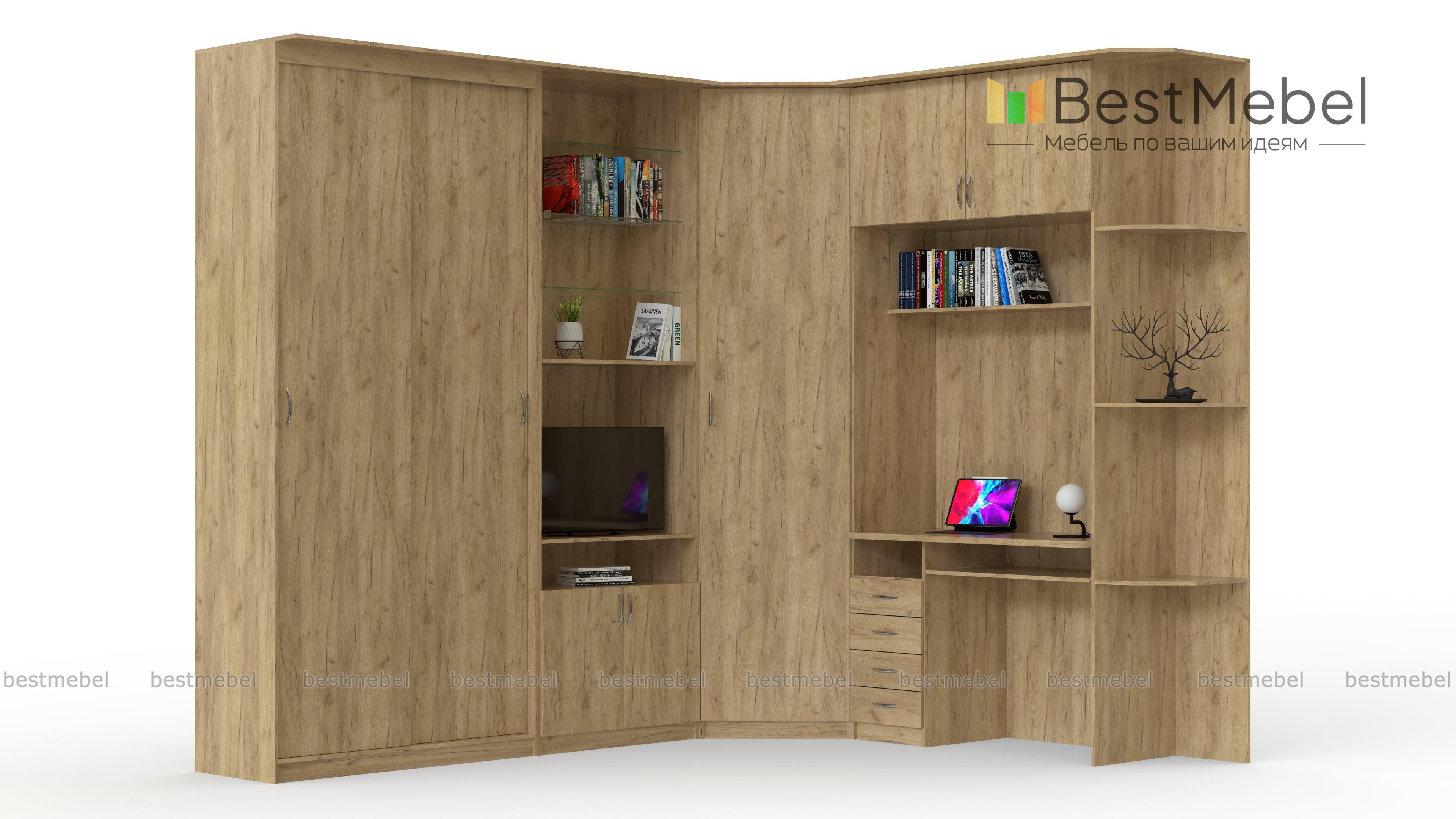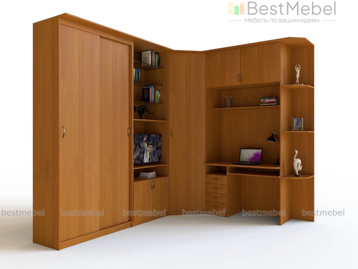 Угловой шкаф со столом Композиция-1 BMS отличается лаконичным и функциональным дизайном, который будет легко вписать в интерьер современного рабочего кабинета, молодежной комнаты. Композиция включает в себя двухдверный шкаф-купе для одежды, угловой шкаф, комбинированную секцию с тумбой, нишей под ТВ и полками, компьютерный стол с антресолью и торцевой стеллаж. Вы сможете не только хранить под рукой все необходимые рабочие материалы и книги, но и компактно разместить предметы гардероба. Купить угловой шкаф со столом Композиция-1 BMS приглашаем в наш интернет-магазин.