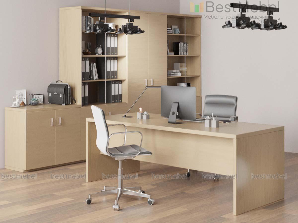 Кабинет руководителя Вакса 5 BMS станет универсальным решением для современных офисных интерьеров. Входящие в комплект предметы отличаются функциональностью, надежностью, лаконичным современным дизайном. Композиция объединила рабочий стол с классической прямоугольной столешницей, два комбинированных шкафа со стеклянными дверцами для хранения документов, гардероб и распашную тумбу. Купить кабинет руководителя Вакса 5 BMS, выполненный в нейтральных древесных тонах, приглашаем в наш интернет-магазин.