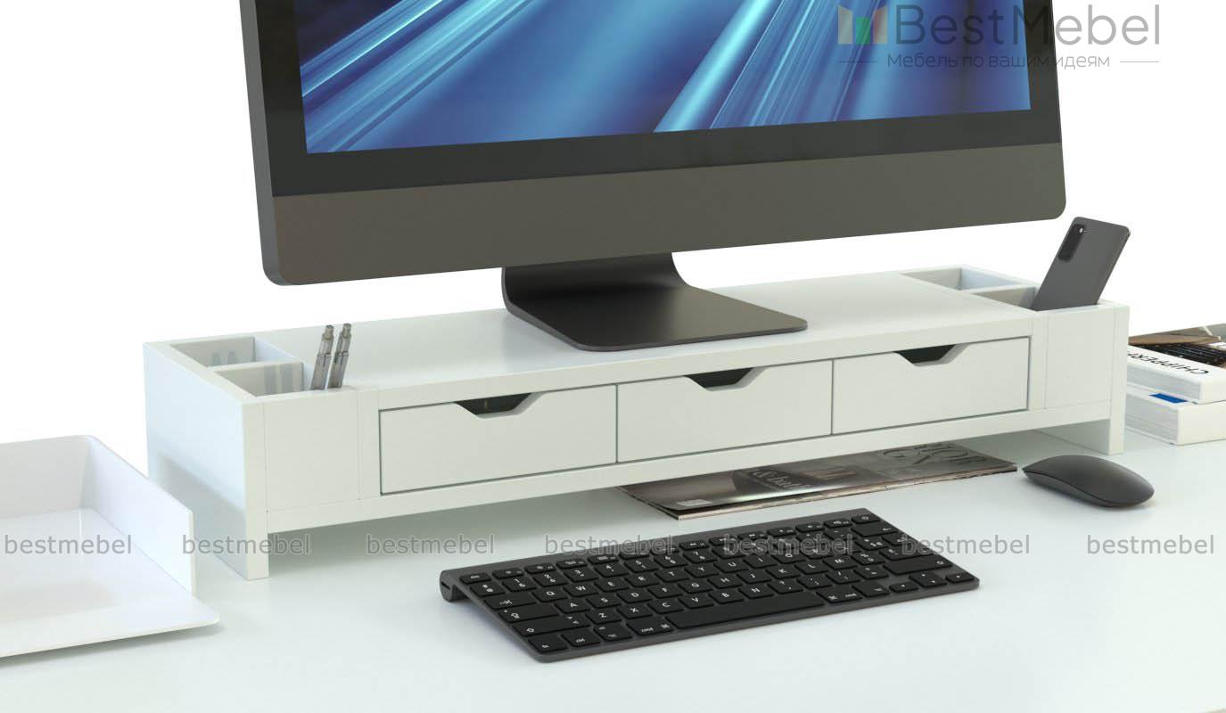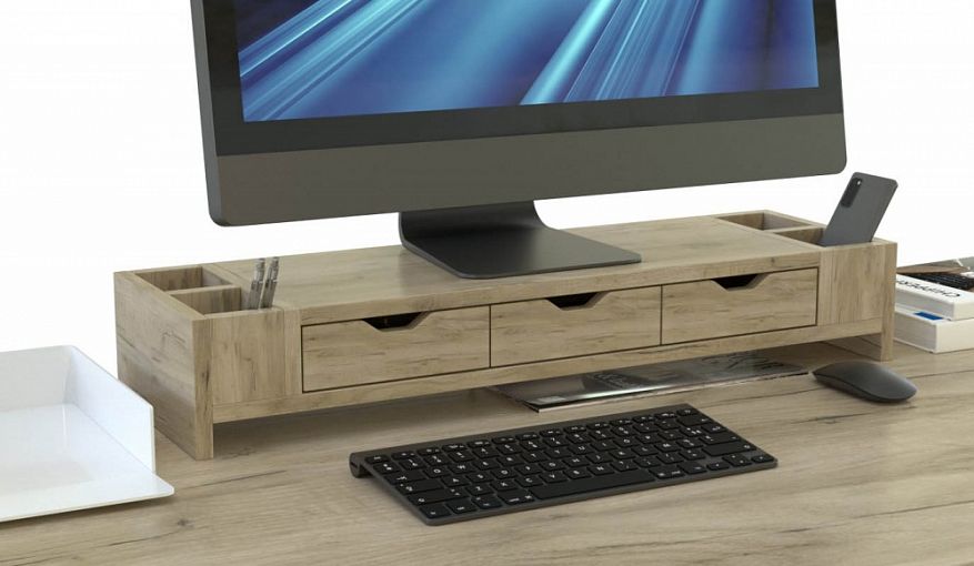 Подставка под монитор Лакрица-4 BMS поможет вам разместить экран на комфортной высоте и снизить нагрузку на спину. Модель с тремя выдвижными ящиками и четырьмя открытыми боковыми отсеками обеспечит удобное хранение канцелярских принадлежностей, а для бумаг и клавиатуры предусмотрена просторная ниша. Выполненная в тон корпусу стола, подставка органично вписывается в домашний и офисный интерьер. Купить подставку под монитор Лакрица-4 BMS вы сможете недорого на сайте нашего интернет-магазина.