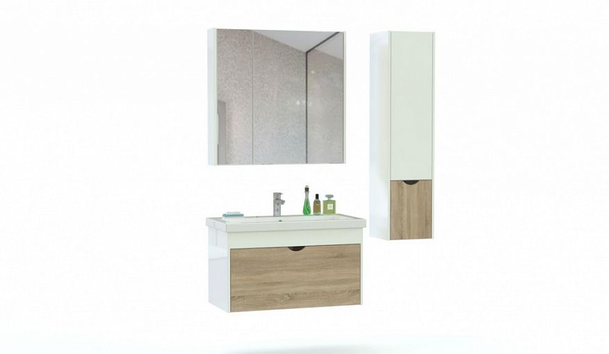 Мебель для ванной Ника 5 BMS олицетворяет современные тенденции дизайна. Минималистичная подвесная композиция включает в себя широкую тумбу, оборудованную выдвижным ящиком для хранения гигиенических принадлежностей, компактный распашной пенал и двухдверный распашной шкаф с полностью зеркальным фасадом. Поверхности в белом глянце в сочетании с древесным оттенком отличаются влагостойкостью, простотой ухода и сохраняют эстетичный вид на протяжении всего срока службы. Купить мебель для ванной Ника 5 BMS вы сможете в нашем интернет-магазине.