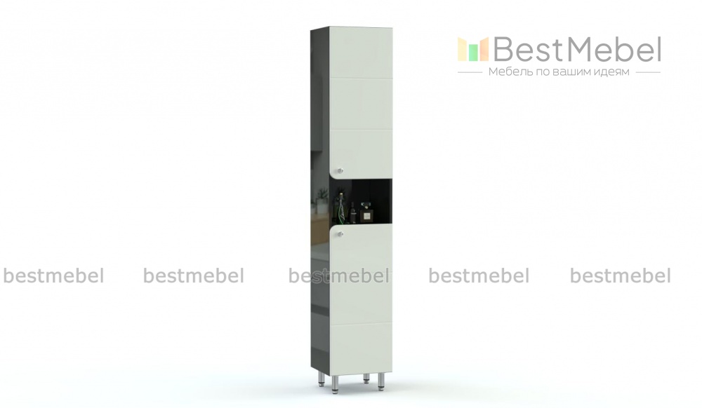 Пенал для ванной комнаты Клео 6 BMS экономно использует пространство за счет небольшой ширины. Пристенная модель располагается на регулируемых хромированных опорах и выполнена в актуальном сочетании черного и белого, дверцы скруглены по углам и декорированы горизонтальной фрезеровкой. Компактно разместить все необходимые уходовые средства и аксессуары помогут вам два распашных отделения с полками и ниша в центральной части. Купить пенал для ванной комнаты Клео 6 BMS приглашаем в наш интернет-магазин.