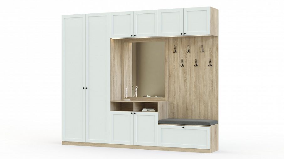 Прихожая Лаки 16 BMS с традиционным оформлением фасадов - для тех, кто ценит простоту и комфорт. Двухдверный шкаф для одежды, комбинированная с зеркалом тумба, обувница с тканевым сиденьем, открытая вешалка и антресоли объединены в элегантную композицию. Благодаря светлым фасадам помещение кажется больше, а подсветка по нижнему краю антресолей добавляет интерьеру уюта. Купить прихожую Лаки 16 BMS с выбором размеров, цвета и фурнитуры вы сможете в нашем интернет-магазине.