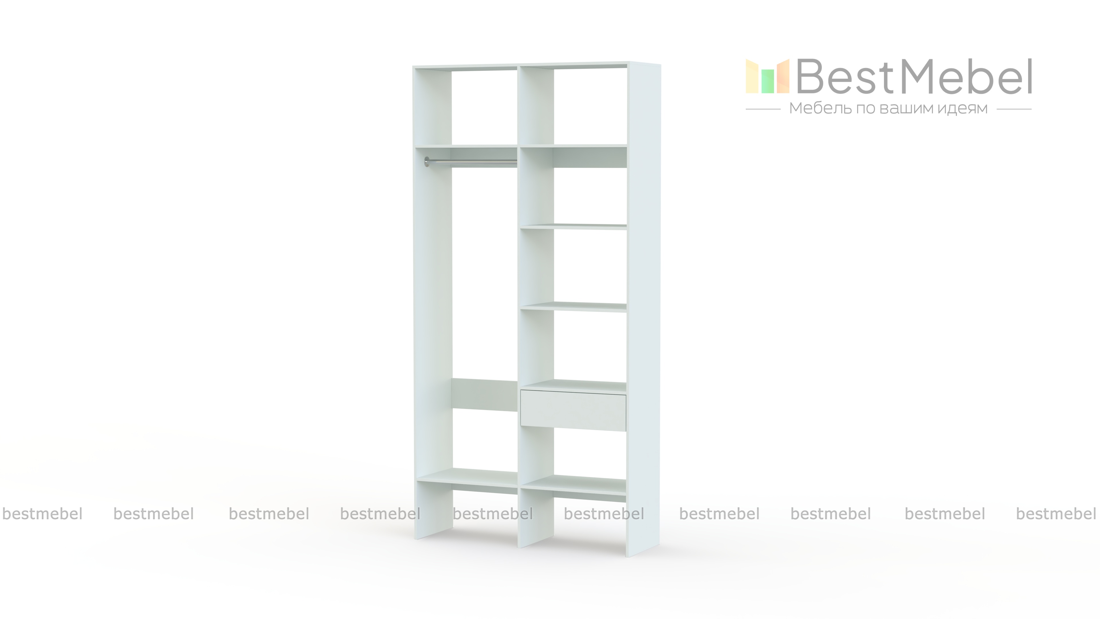 Стеллаж для одежды Мирта 7 BMS – это стандартное платяное отделение со штангой и секция для белья, укомплектованная полками и ящиком. Компактный и легкий, открытый стеллаж заменит шкаф в небольшой комнате или разместится в гардеробной. Современный функциональный дизайн сочетается с базовым светлым оттенком, делая модель по-настоящему универсальной.