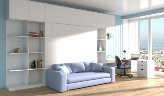 Шкаф-кровать с диваном Долли 52 BMS отличается простым и эффектным дизайном в стиле минимализм. Высокая функциональность композиция позволит вам сэкономить полезную площадь молодежной комнаты или студии. Белоснежная модель оборудована вместительными книжными стеллажами, антресолью и откидным модулем с кроватью и оригинальным скругленным диваном. В изголовье комфортного спального места располагаются открытые полочки для мелочей. Купить шкаф-кровать с диваном Долли 52 BMS для визуально легкого и эргономичного интерьера приглашаем к нам в интернет-магазин.