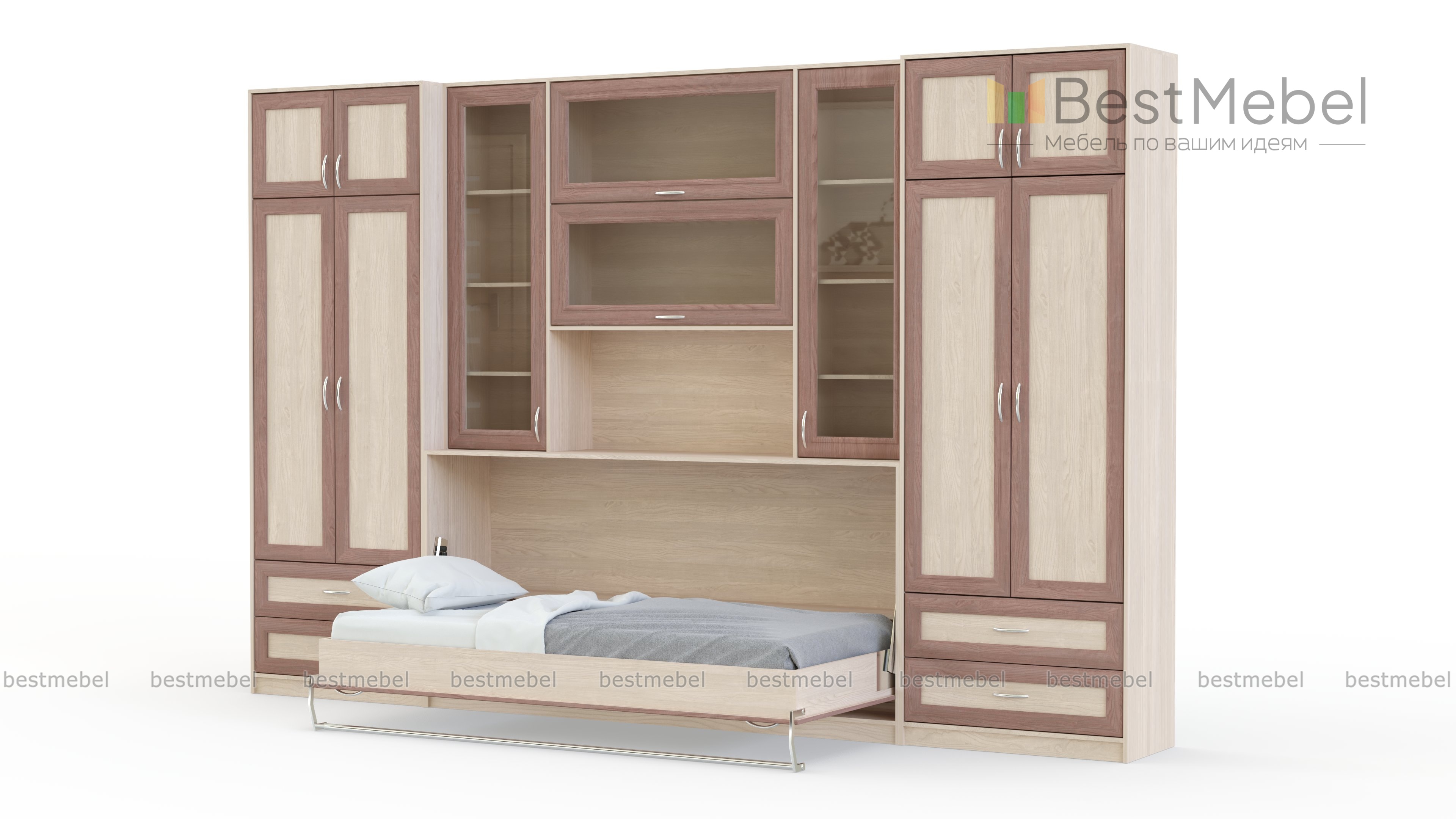 Шкаф-кровать трансформер Бриош BMS поможет рационально подойти к организации пространства в небольших и узких помещениях. Практичным решением станет современная композиция 2 в 1, объединившая удобную систему хранения и спальное место. В комплекте два комбинированных шкафа для белья и одежды, застекленные книжные полки и откидная кровать с горизонтальным механизмом подъема. Эффектно подчеркнут геометричность дизайна светлые фасады с контрастной окантовкой. Купить шкаф-кровать трансформер Бриош BMS приглашаем в наш интернет-магазин.