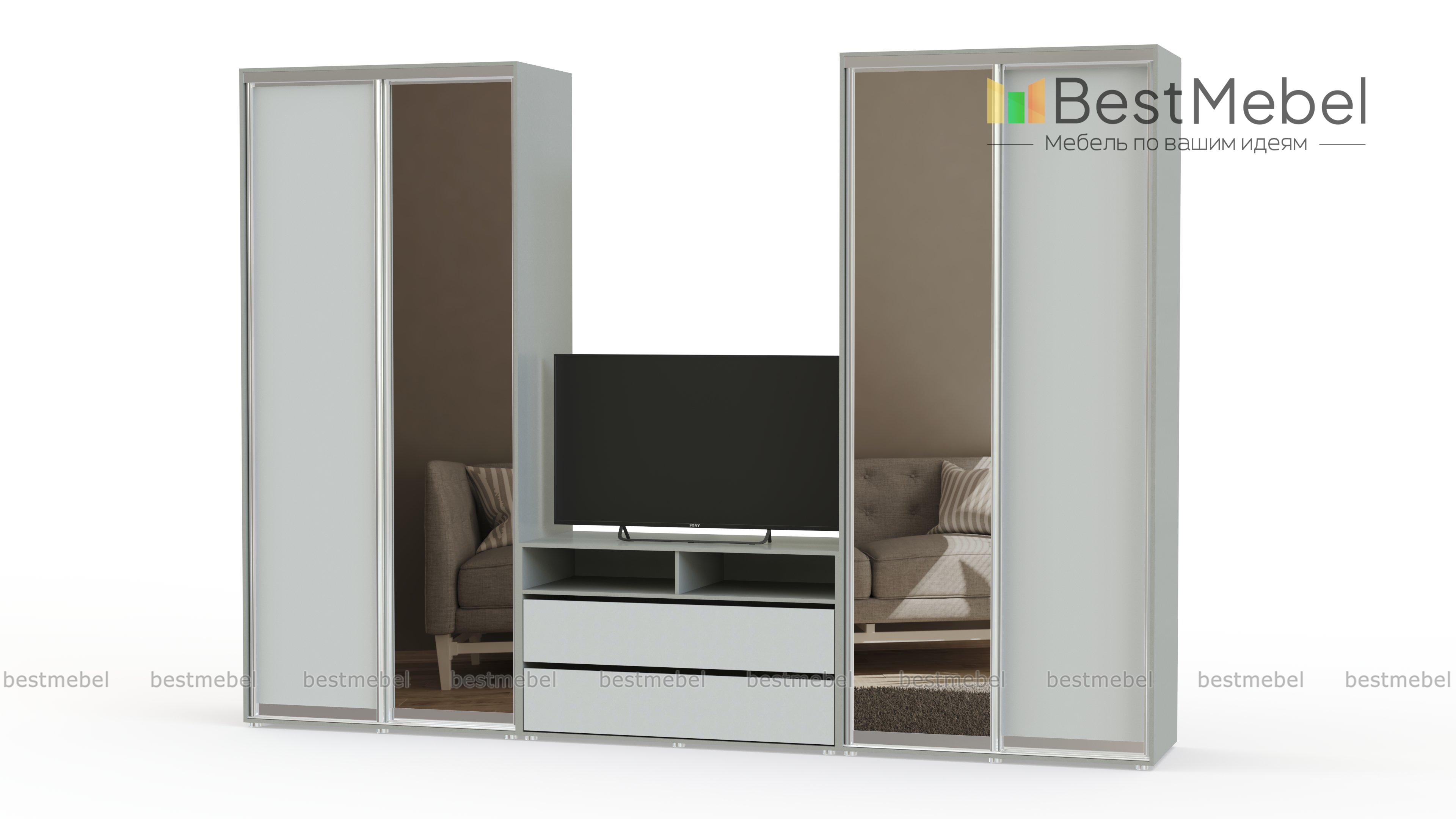 Двойной шкаф-купе Натан 4 BMS – практичное решение для гостиной, объединившее ТВ-зону и удобную систему хранения. В центре композиции располагается тумба под аппаратуру с нишами и выдвижными ящиками, а по бокам – двухдверные платяные шкафы-купе. Лаконичные по дизайну, элементы выполнены в натуральных оттенках под массив дерева, зеркальные дверцы придают комнате дополнительный объем и глубину. Купить двойной шкаф-купе Натан 4 BMS и сэкономить полезную площадь вам поможет наш интернет-магазин.
