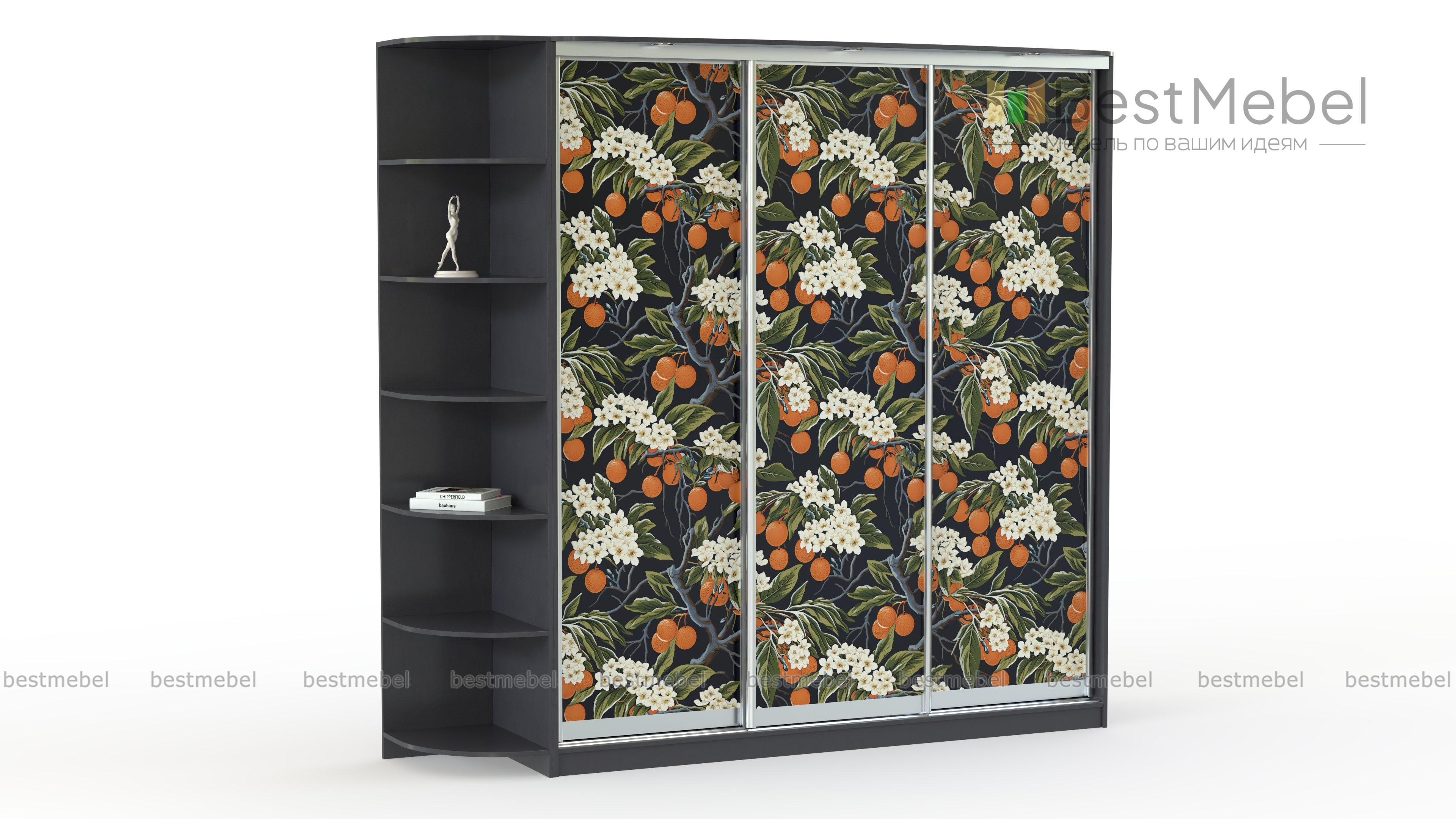 Шкаф-купе Оротава № 38 BMS украшен сочным фруктовым принтом на контрастном фоне. Для удобного размещения предметов гардероба, бытовых мелочей, книг и декора комбинированная модель оборудована не только трехдверным отделением-купе, но и плавно закругленным стеллажом. Встроенные в козырек светильники делают пользование комфортным, а атмосферу в комнате - камерной и уютной. Купить шкаф-купе Оротава № 38 BMS, изготовленный по вашим размерам, вы сможете в нашем интернет-магазине.