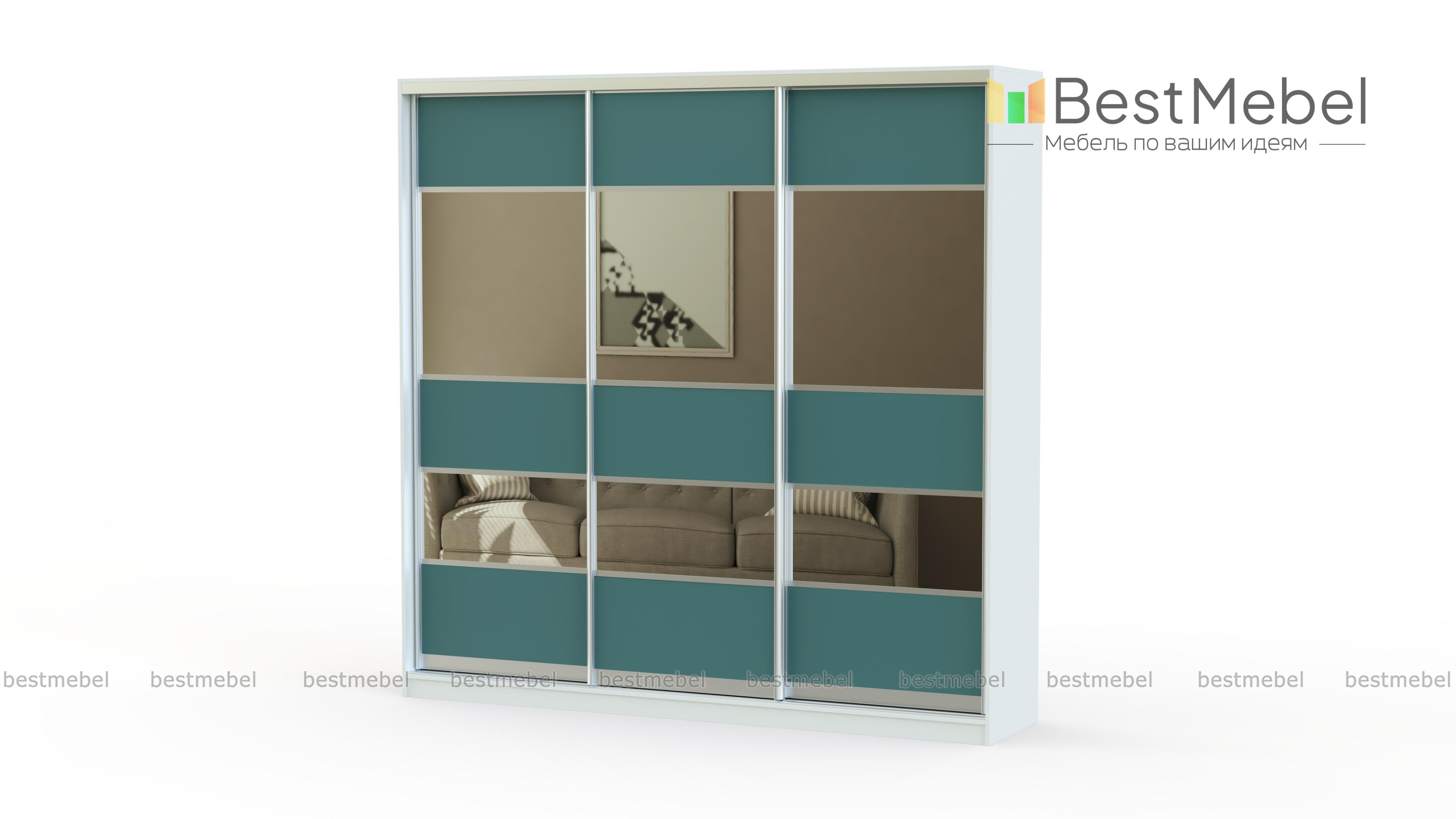 Шкаф-купе Мекка BMS может похвастаться стильным дизайном. Фасад имеет цветные вставки и зеркала. Данная модель прекрасно впишется в любое жилое и нежилое помещение, будь то спальная комната или коридор.