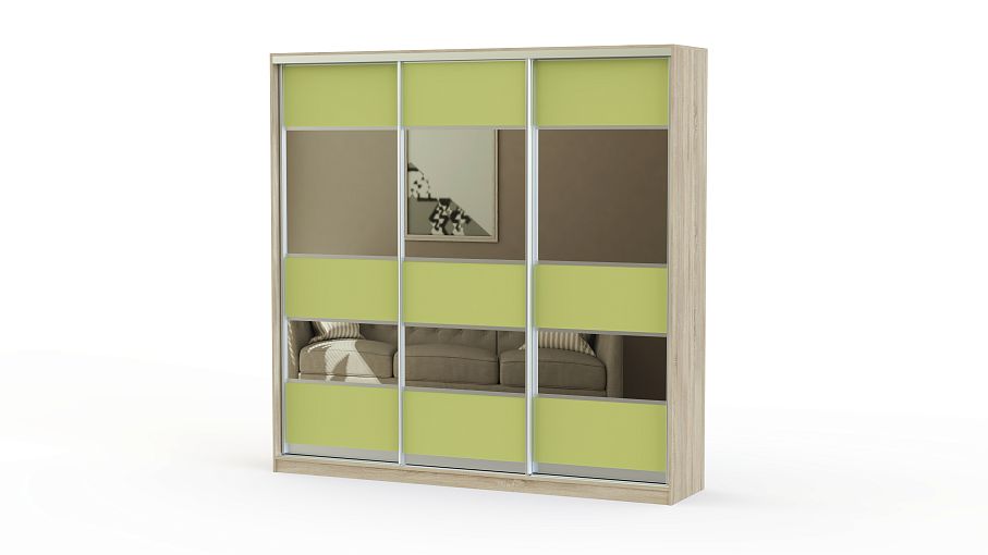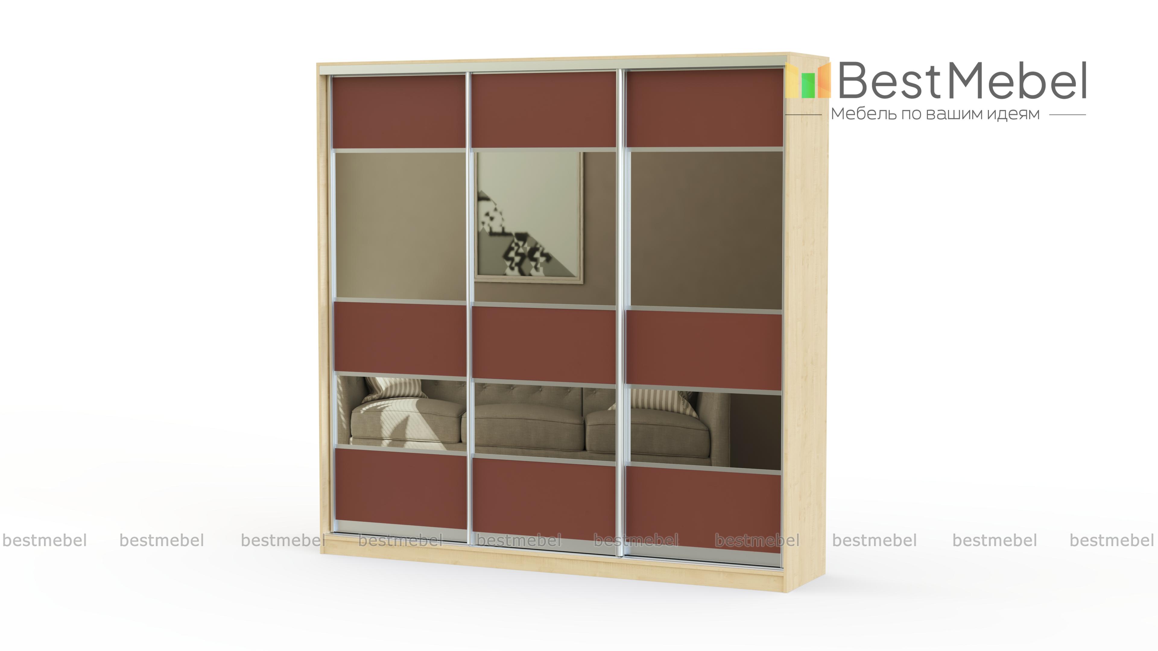 Красивый и стильный трёхдверный шкаф-купе с необычным комбинированным фасадом. Имеет достаточно вместительное внутреннее наполнение, в котором есть специальные отделения практически для всех видов одежды. Корпус, фасад и полки сделаны из качественного обработанного ДСП, который выдерживает даже значительные нагрузки. А хорошая фурнитура прекрасно дополняет общую картину.