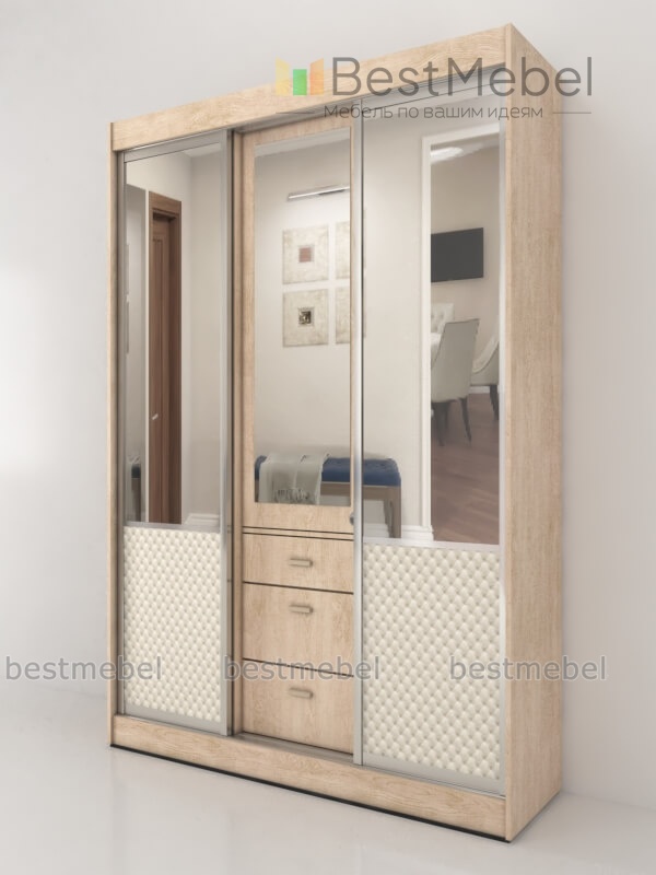 Шкаф-купе МТ 2.4.3 BMS – вместительная модель, оборудованная удобной системой хранения, позволяющей разместить белье, одежду и многое другое. Комбинированный шкаф сочетает два раздвижных отделения и центральное с распашным зеркальным шкафчиком и тремя выдвижными ящиками для мелочей. Возможность дополнить зеркальные дверцы вставками из искусственной кожи, пластика или пленки позволяет наиболее гармонично вписать модель в интерьер. Купить шкаф-купе МТ 2.4.3 BMS приглашаем в наш интернет-магазин по лучшей цене.