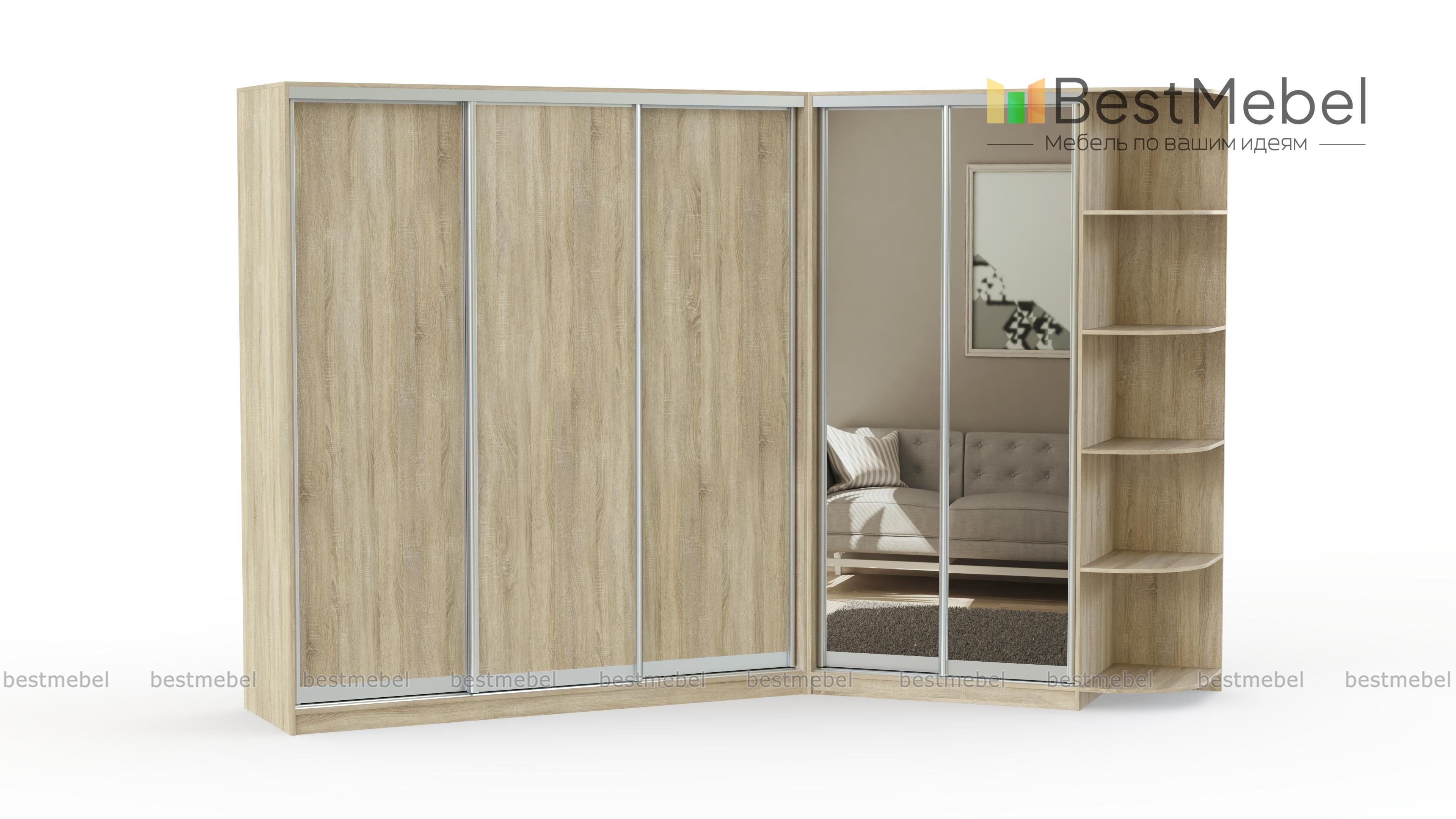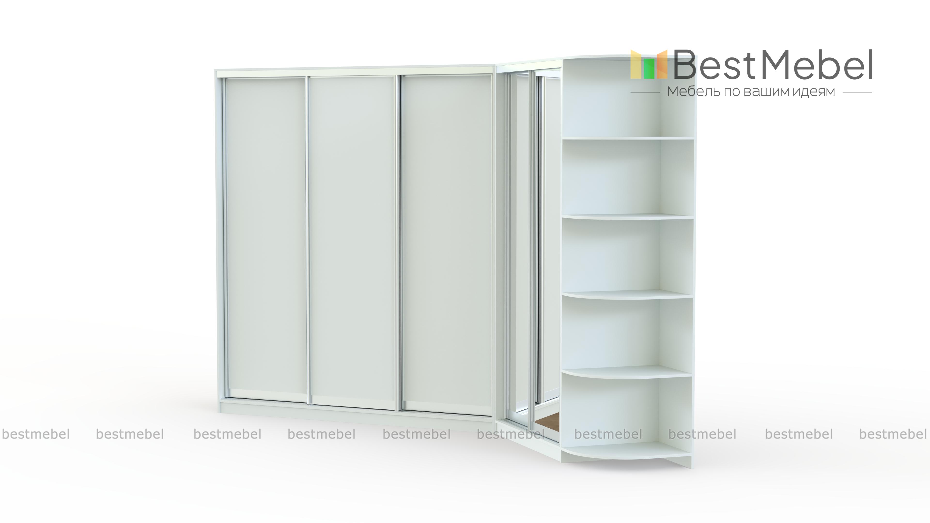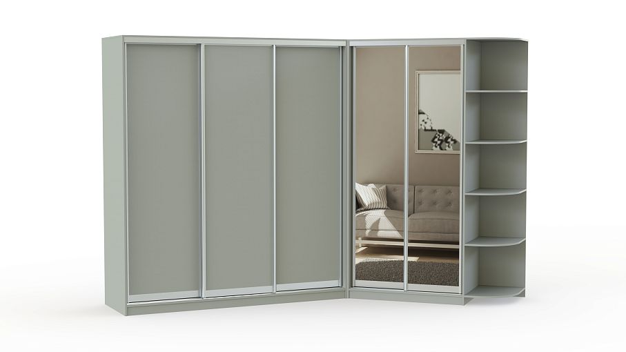 Большой угловой шкаф-купе с приставкой. В дизайне изделия предусмотрено сочетание ДСП и зеркал. Конструкция шкафа имеет огромное количество полочек разного размера и отделения со штангами для одежды на вешалках. А на угловой приставке удобно расположатся фото, сувениры и другие вещи, которые Вы захотите выставить на общее обозрение.
