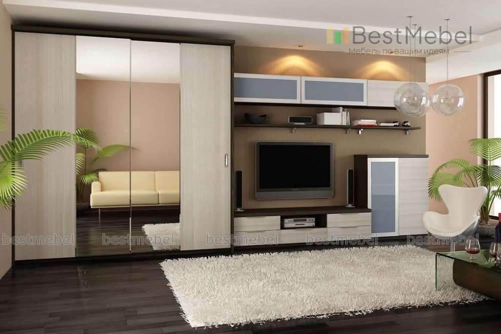 Уютно и современно можно обставить гостиную с помощью шкафа купе TV-18 BMS. Он не нуждается в рекламе, его внешний вид говорит сам за себя. Одного взгляда достаточно, чтобы понять, что перед нами великолепный образчик мебели, который преобразит любое помещение, поможет разложить по полкам все вещи, чтобы в нем царили покой и порядок. Объемный шкаф с зеркальными раздвижными дверями вместит гардероб всех членов семьи. Невысокий приставной шкаф с выдвижными ящичками – отличное место для размещения телеаппаратуры. В шкафчике с распашной дверцей и ящиками можно хранить документы, книги, разные бытовые мелочи. Навесные полки, закрытые стеклянными дверками молочного цвета вместе с открытой полкой приятно дополняют общую картину, создаваемую моделью. Купить изделие можно на сайте, изменив параметры на свое усмотрение.