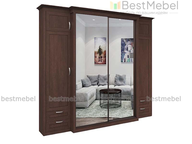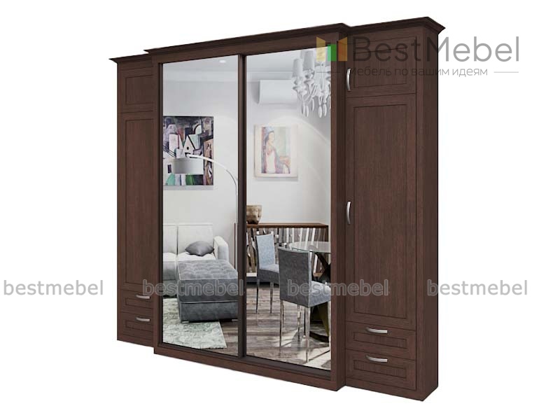 Шкаф-купе Вердженс BMS выполнен из экологичных материалов высокого качества и отличается крупными габаритами, массивностью и элегантным классическим декором. Модель на редкость вместительна за счет комбинированной конструкции и представляет собой сочетание центрального раздвижного отделения с зеркальными фасадами и симметрично расположенных распашных пеналов с выдвижными ящиками в основании. Шкаф в традиционных древесных тонах украшен карнизом и фрезерованными фасадами. Купить шкаф-купе Вердженс BMS для меблировки спальни приглашаем в наш интернет-магазин.
