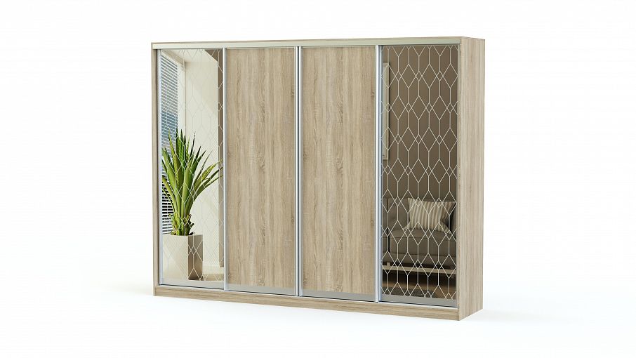 Шкаф-купе Виват 3 BMS компактно разместит ваши вещи и придаст комнате дополнительную глубину. В оформлении фасада четырехдверной модели использованы ламинированная плита светлого древесного оттенка и зеркала. Раздвижным створкам не требуется свободное пространство для открывания, в результате чего даже крупногабаритная конструкция не занимает много места. Купить шкаф-купе Виват 3 BMS приглашаем в наш интернет-магазин с возможностью изготовления по индивидуальным размерам.
