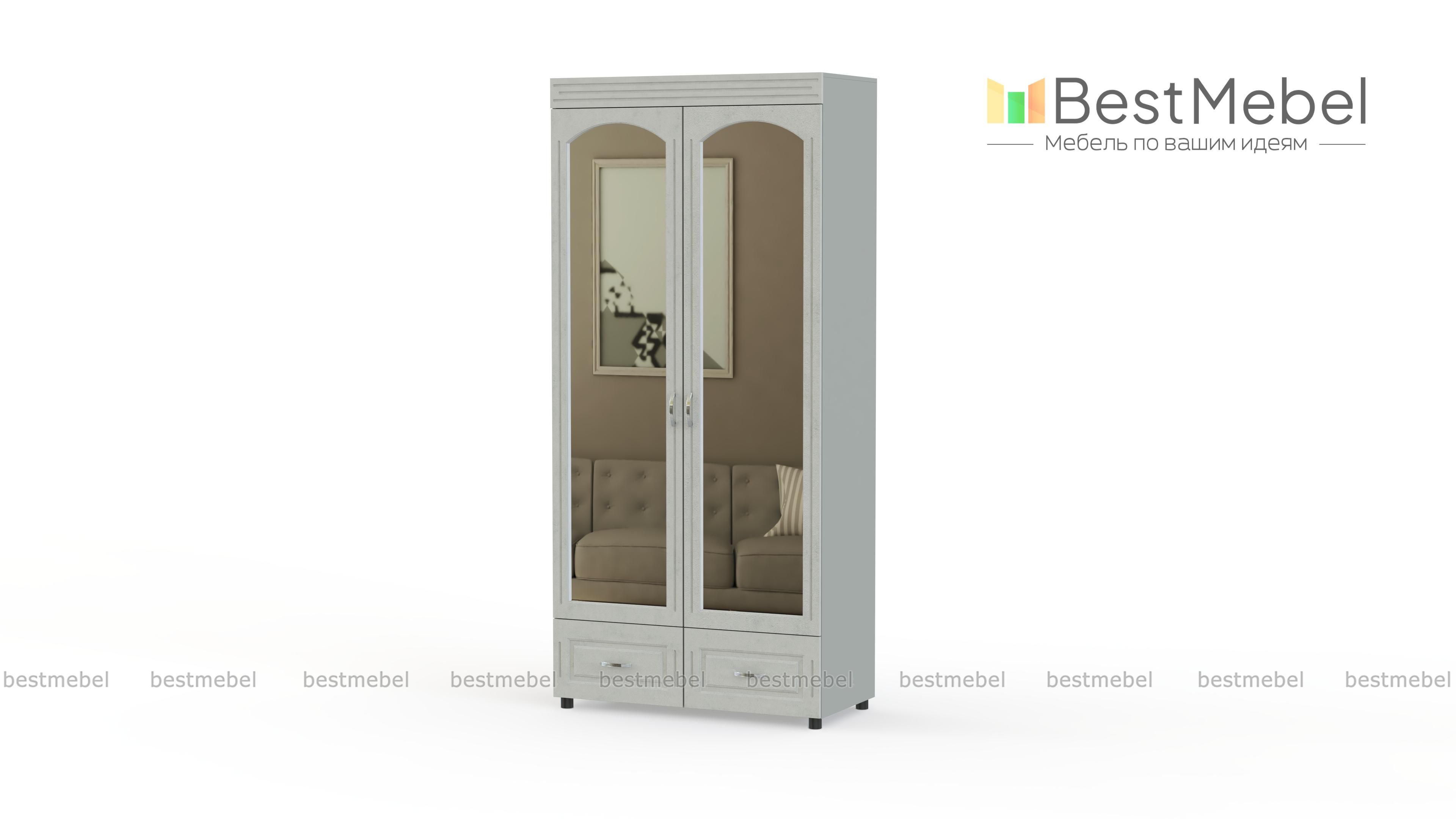Распашной шкаф Элизабет К 3 BMS сочетает в себе достоинства классических и современных моделей. Высокий двухдверный шкаф оборудован платяным отделением со штангой и дополнен двумя выдвижными ящиками для мелочей в основании. Фасад с арочными зеркалами выполнен в светлых тонах и декорирован фрезеровкой. Купить распашной шкаф Элизабет К 3 BMS для меблировки спальни, гостиной или прихожей вы всегда сможете в нашем интернет-магазине.
