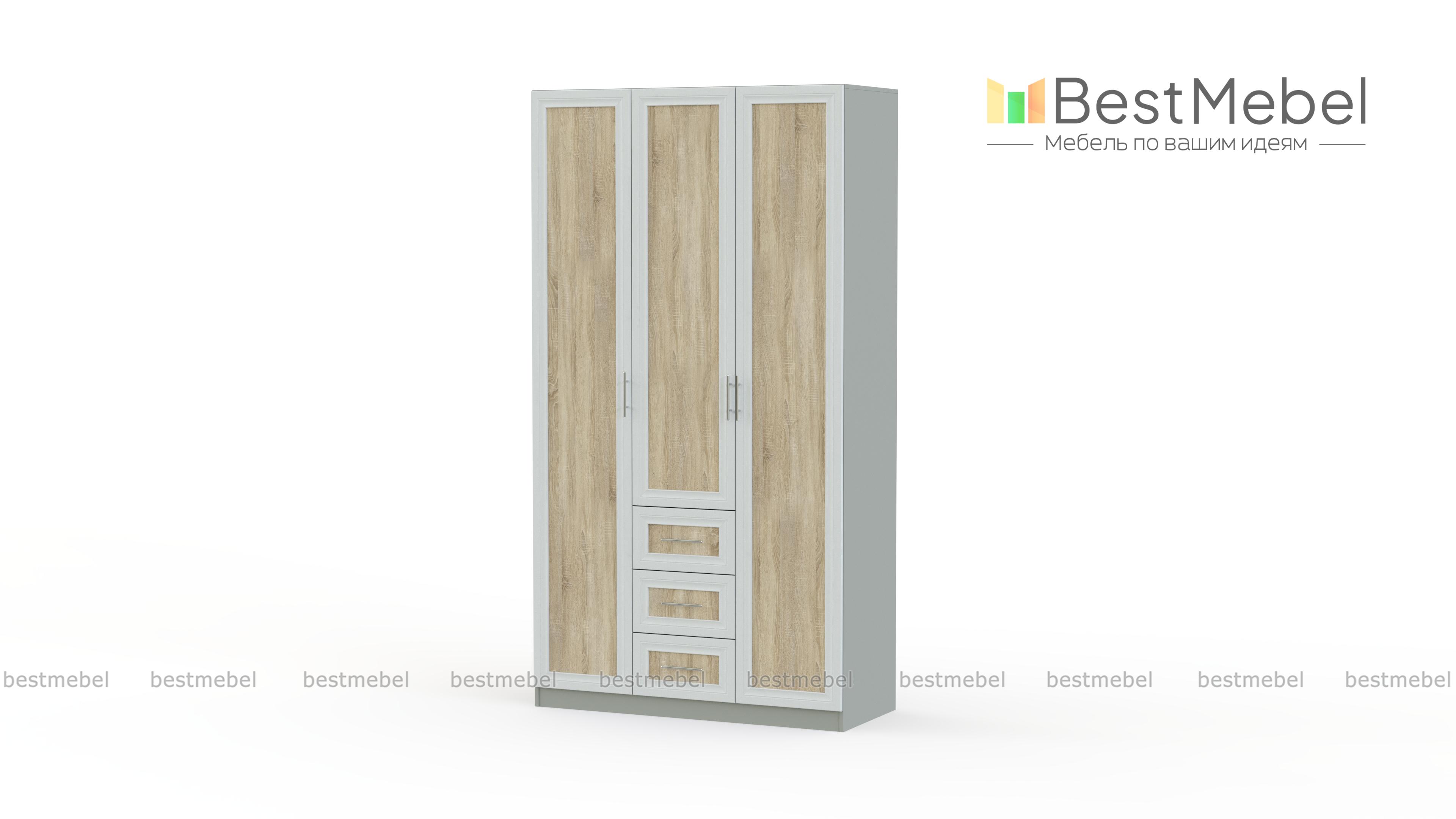 Распашной шкаф Крона 15 BMS отличается характерными для всей серии надежностью, вместительностью и элегантным дизайном. Модель выполнена в контрастных тонах светлой гаммы и органично впишется в интерьер спальни или прихожей. За тремя распашными дверцами с рамочными фасадами – два платяных отделения и центральная секция с полками и выдвижными ящиками для мелочей. Купить распашной шкаф Крона 15 BMS и оборудовать эффектную и функциональную комнату вам поможет наш интернет-магазин.