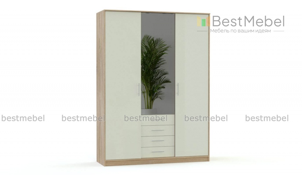 Распашной шкаф Мишель 1 BMS имеет продуманную систему хранения. Помимо платяного отделения со штангой и бельевых полок модель оборудована четырьмя выдвижными ящиками, в которых будут под рукой мелкие вещи. Классическая распашная конструкция сочетается с актуальным цветовым решением – корпус в натуральных древесных тонах и белый глянцевый фасад. Центральная створка шкафа представляет собой зеркало. Купить распашной шкаф Мишель 1 BMS для создания комфортного спального интерьера вы сможете в нашем интернет-магазине.
