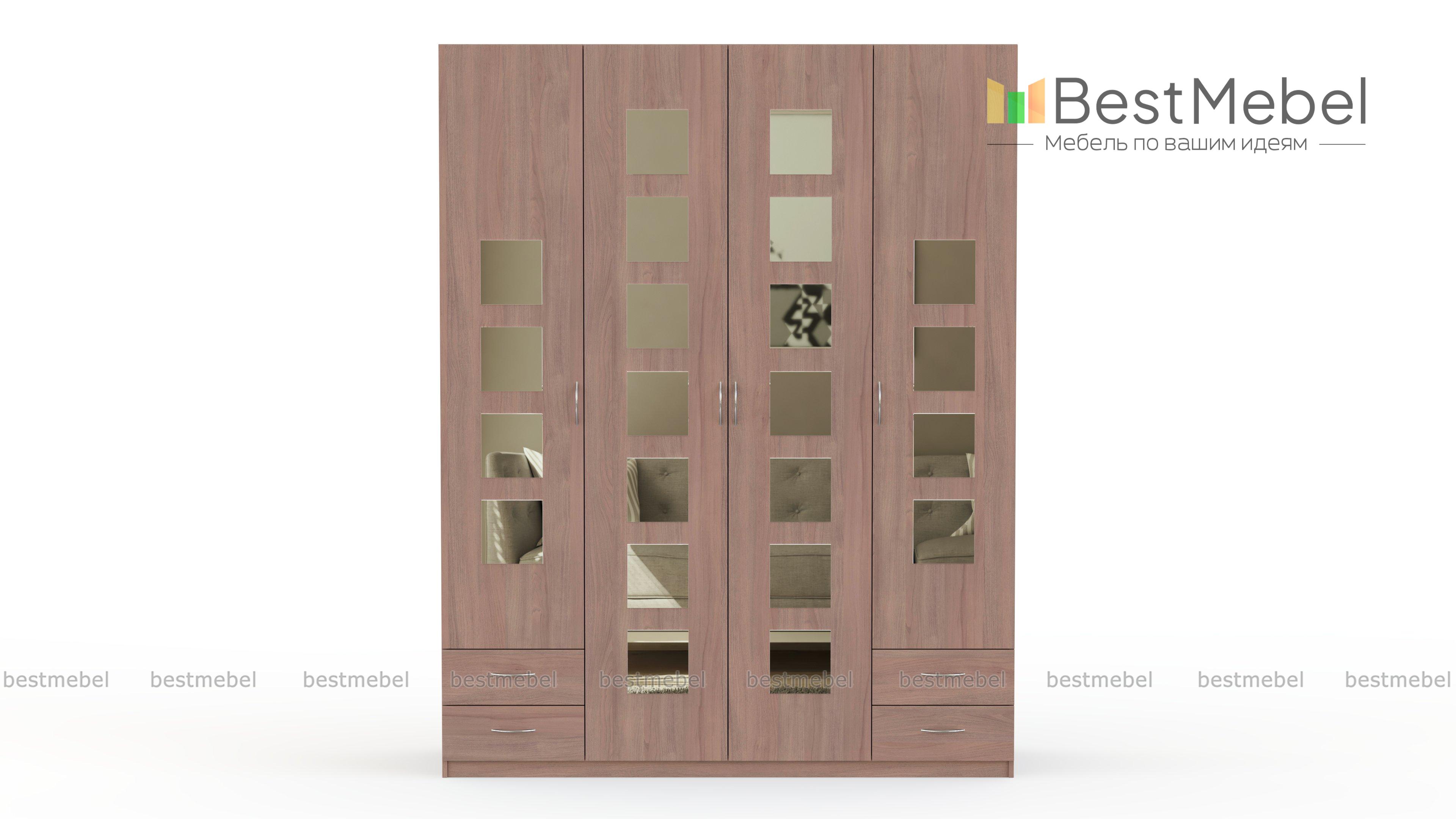 Распашной шкаф Паулина 32.2 BMS легко решит проблему хранения большого количества вещей и займет одно из центральных мест в интерьере. Разместить предметы гардероба и домашний текстиль вам помогут платяное отделение, полки и четыре выдвижных ящика в нижней части. В элемент дизайна превращает четырехдверную модель фасад, декорированный квадратными зеркальными накладками. Купить распашной шкаф Паулина 32.2 BMS вы сможете выгодно в нашем интернет-магазине, подобрав оптимальные параметры.