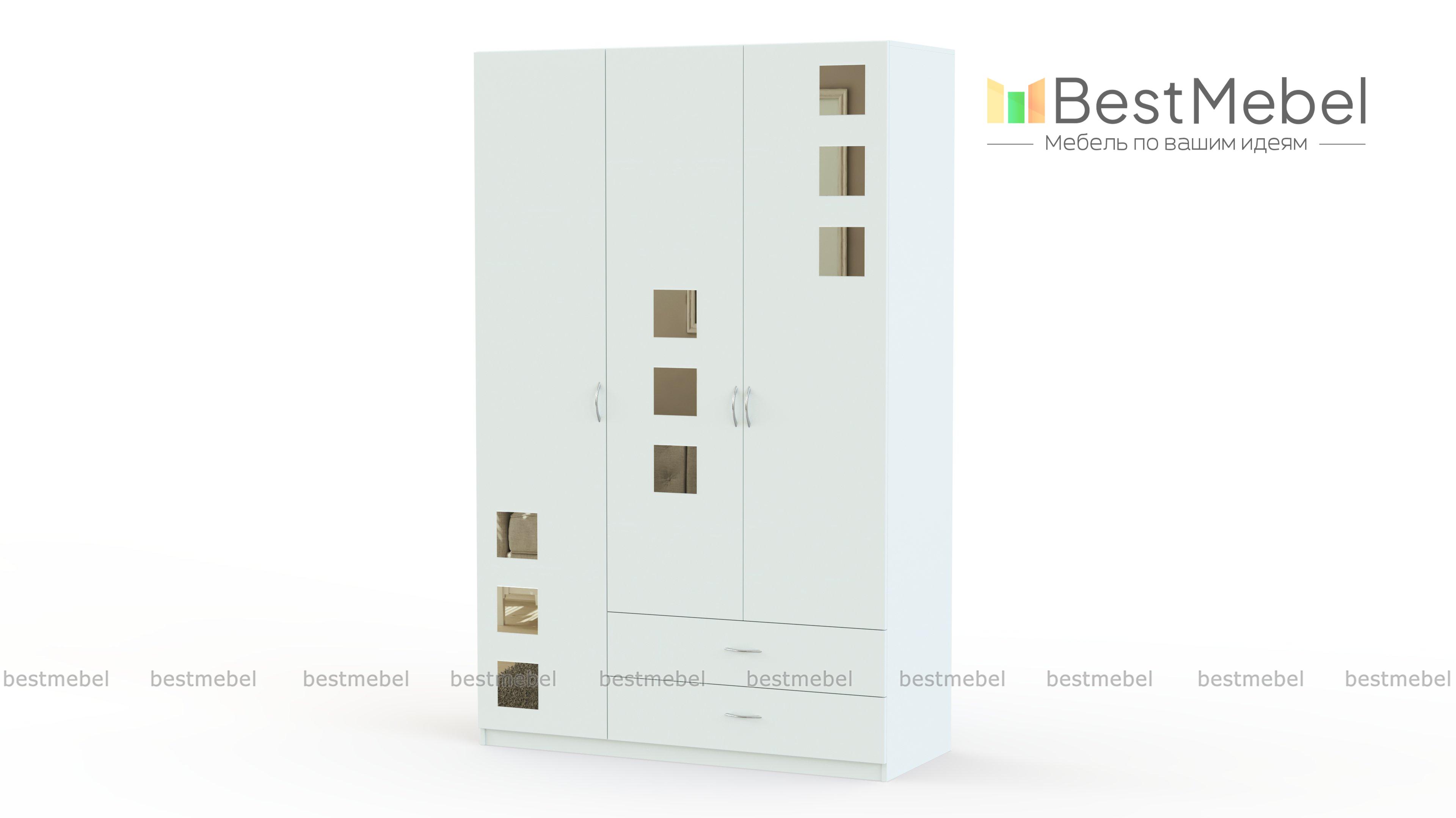 Распашной шкаф Паулина 40 BMS – это надежная классическая конструкция, хорошая вместительность и современный дизайн. Комбинированная трехдверная модель оборудована отделениями с полками и штангой и дополнена двумя широкими выдвижными ящиками в нижней части. Шкаф выполняется в древесных оттенках на выбор и декорирован по фасаду квадратными зеркалами. Купить распашной шкаф Паулина 40 BMS по доступной цене приглашаем на сайт нашего интернет-магазина.