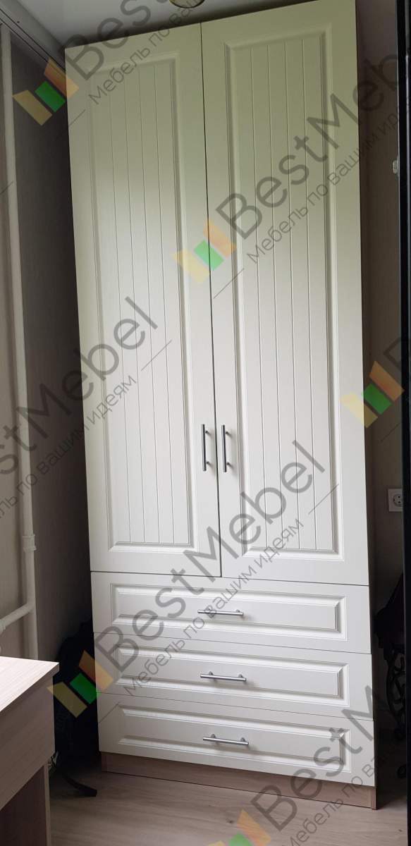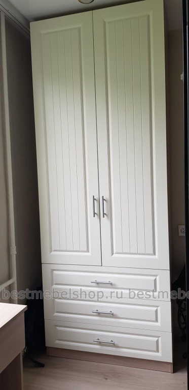 Заказ 00000681637, изделие ЭСКИЗ №00000681637 Распашной шкаф Прага 905 BMS (900х2065х500)Брал этот шкаф для моего гардероба. Модель понравилась тем, что есть три ящика внизу – ты получаешь и шкаф для рубашек и брюк, и комод для вещей, которым не нужна вешалка. Наверху удобно хранить головные уборы и шарфы.Про качество: оно очень крутое! Выбрали покрытие фасадов «структура дерево белый» по фото и не прогадали – выглядит очень реалистично, реально как будто массив дерева покрасили в белую эмаль.Доставка быстрая – меньше, чем за неделю, до подъезда в Воронеже, совершенно бесплатно. Детали шкафа из МДФ и ЛДСП упакованы в картонные коробки, фасады между собой проложены пенной плёнкой. Штанга была в стейтч-плёнке, куча слоёв. Фурнитура лежала в черном пакете, все детали под расчёт – всего хватило, лишних не было. Сколов и прочих дефектов не было.Сборка лёгкая, несмотря на непошаговую инструкцию. Просто на каждой детали были наклейки (при сборке мебели других производителей приходилось рулеткой замерять детали, чтобы понять, где какая). Все детали между собой крепятся одинаково – евровинтами (конферматами), не важно, в каком порядке. (Совет: запаситесь электрической отвёрткой, дело пойдёт быстрее). Фурнитура в базовой комплектации не дешевая – вся металлическая + деревянные шканты. Пластика нет даже у минификсов, как бывает у других фабрик. Пластиковые были только подпятники, чтобы шкаф скользил по полу, когда его двигаешь. Петли, которые были в комплекте, прочные, их легко регулировать.Оператор интернет-магазина по телефону согласовал со мной все детали заказа по цвету, фрезеровке и фурнитуре. Я попросил не делать присадку для ручек, так как собирался ставить свои. Все пожелания учли, спасибо! Цена, качество – всё отлично, смотреть на шкаф очень приятно, пользоваться – одно удовольствие.