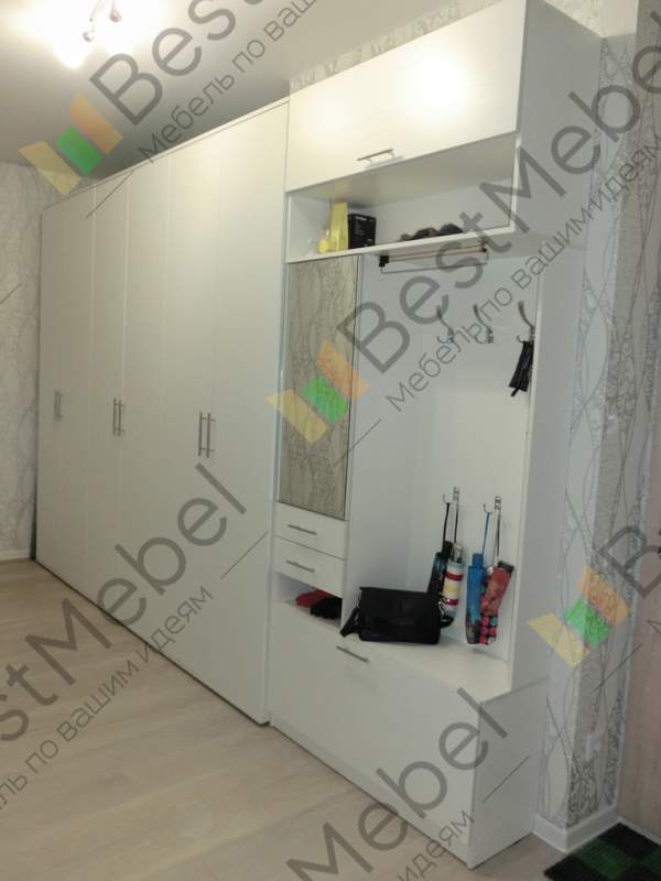 А мы для прихожей заказали три таких шкафа с разной начинкой, получилось не хуже встроенного шкафа, зато дешевле, и на сборке сэкономили, так как собрать 3 небольших шкафа и поставить вряд намного проще, чем один огромный. При выборе дизайна от вставок отказались, оставили сплошные белые. В этой модели хорошие металлические ручки 128мм в стандарте. Собрали сами. Была только одна маленькая проблема - не положили ножки шкафов, зато вложили лишние дверные петли, но Бестмебель оперативно довезли ножки. Петли, кстати, потом пригодились для книжного шкафа мод.110 BMS, о нем также напишу подробно. На фото также прихожая Ева-6. Спасибо, Бестмебель, за отличные шкафы и обслуживание.