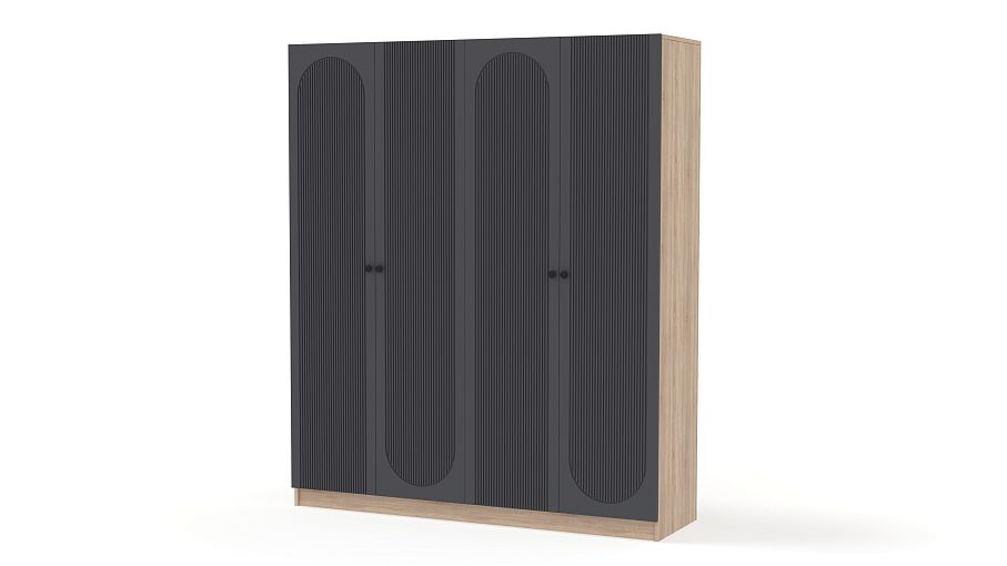 Шкаф распашной Рене 26 BMS сочетает в себе современную эстетику, функциональность и надежность конструкции. Два платяных отделения с дверцами оснащены всем необходимым для хранения одежды на вешалках и в сложенном виде. Геометрический рельеф на фасаде темного оттенка превращает этот вместительный четырехдверный гардероб в центральный элемент дизайна. Купить шкаф распашной Рене 26 BMS приглашаем в наш интернет-магазин с выбором размеров, цвета и фурнитуры.