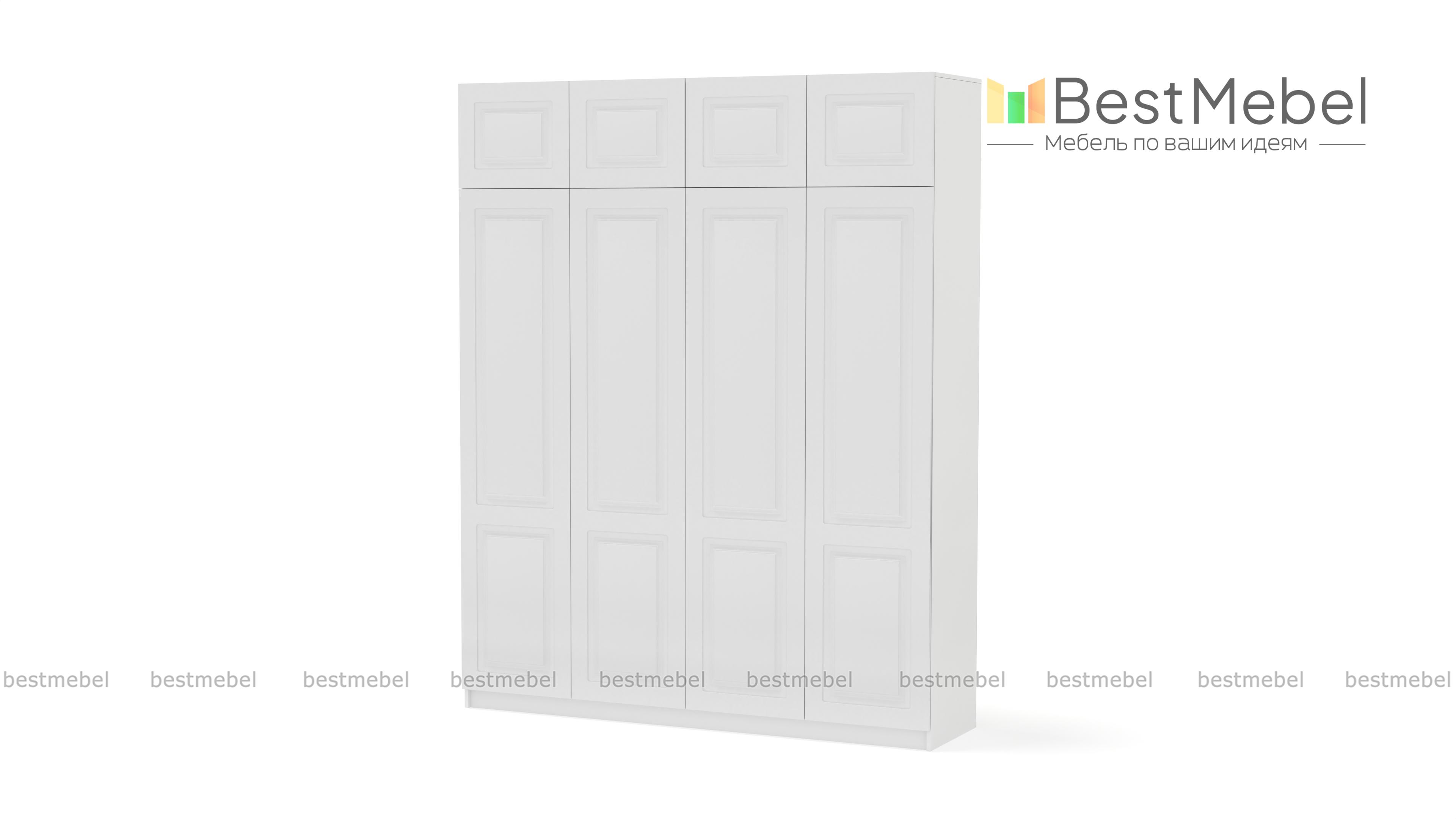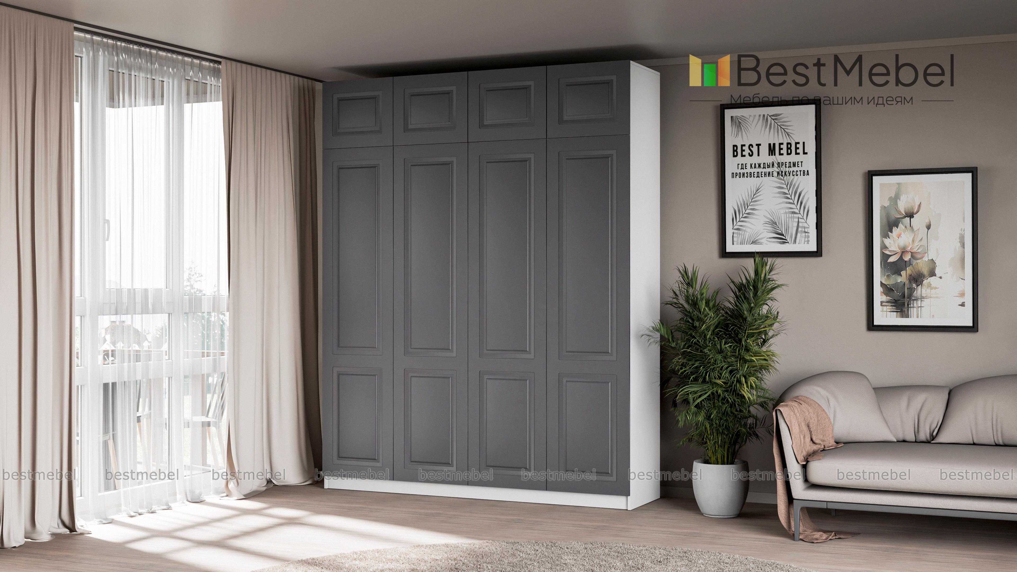 Шкаф распашной Руан 10 BMS - более вместительный по сравнению с аналогичными четырехдверными моделями благодаря антресоли. К основному отделению с двумя платяными секциями разных размеров и полками для белья добавлен дополнительный ярус сверху. Нейтрального цвета фрезерованные фасады - долговечные и достаточно универсальные, корпус выполнен из прочной ламинированной ДСП. Купить шкаф распашной Руан 10 BMS, изготовленный по вашим размерам, приглашаем к нам в интернет-магазин.