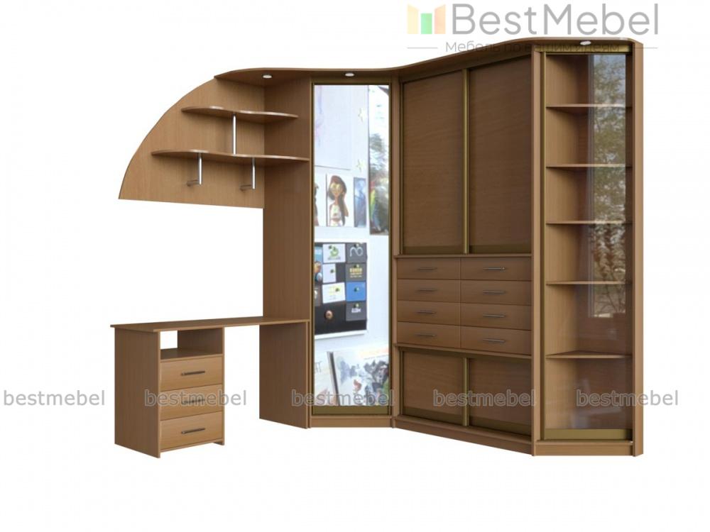 Шкаф угловой 215 BMS - это комбинированная модель с рабочей зоной, позволяющая по максимуму задействовать пространство. Удобная система хранения включает в себя платяные и бельевые отделения, восемь выдвижных ящиков для мелкого трикотажа и торцевую витрину, а над рабочим столом предусмотрены книжные полки. Выполненная в лаконичном современном стиле, композиция дополнена ростовым зеркалом и встроенной подсветкой. Купить шкаф угловой 215 BMS, изготовленный по индивидуальным размерам, вы сможете в нашем интернет-магазине.