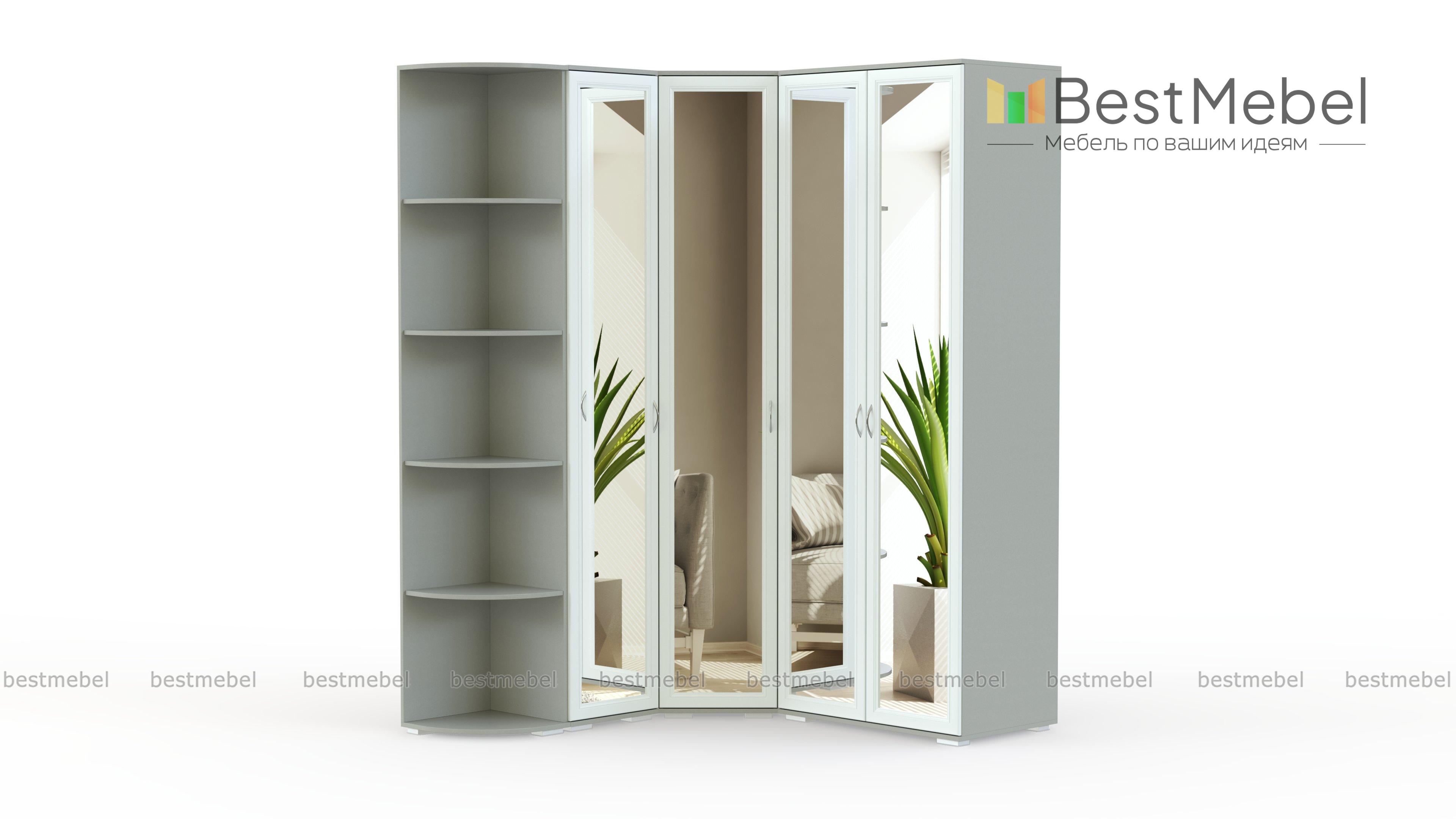 Шкаф угловой Дана 10 BMS в классическом исполнении подходит как для меблировки прихожих, так и спальных интерьеров. Композиция включает в себя однодверный угловой модуль с полками и штангой, двухдверный шкаф с платяным отделением, пенал и плавно скругленный торцевой стеллаж. Зеркальные фасады в элегантных фрезерованных рамах визуально расширяют границы комнаты. Купить шкаф угловой Дана 10 BMS и эффективно использовать доступное пространство вам поможет наш интернет-магазин.