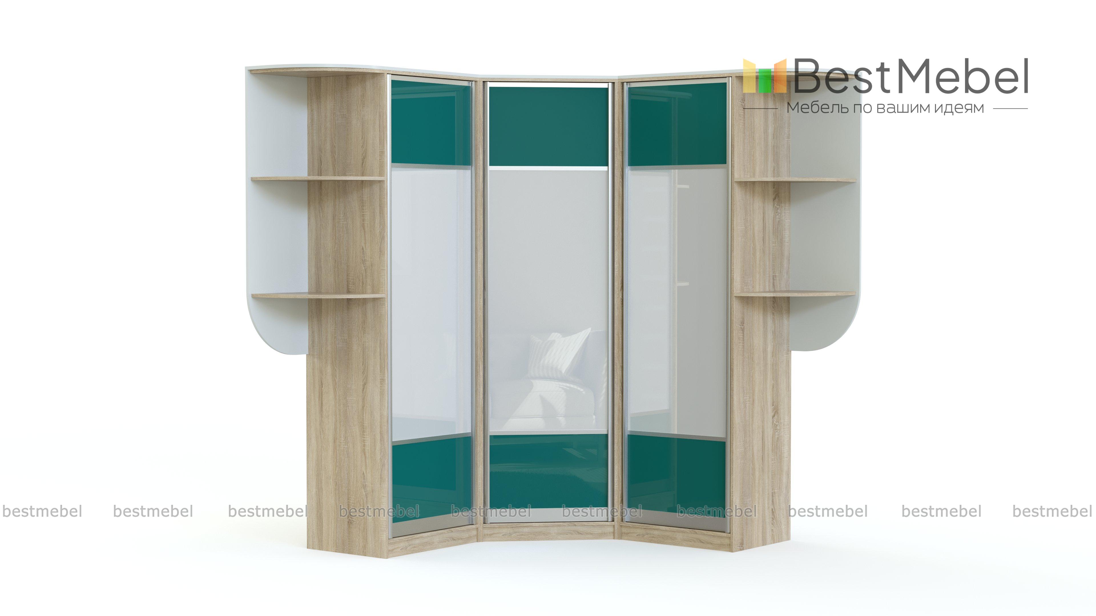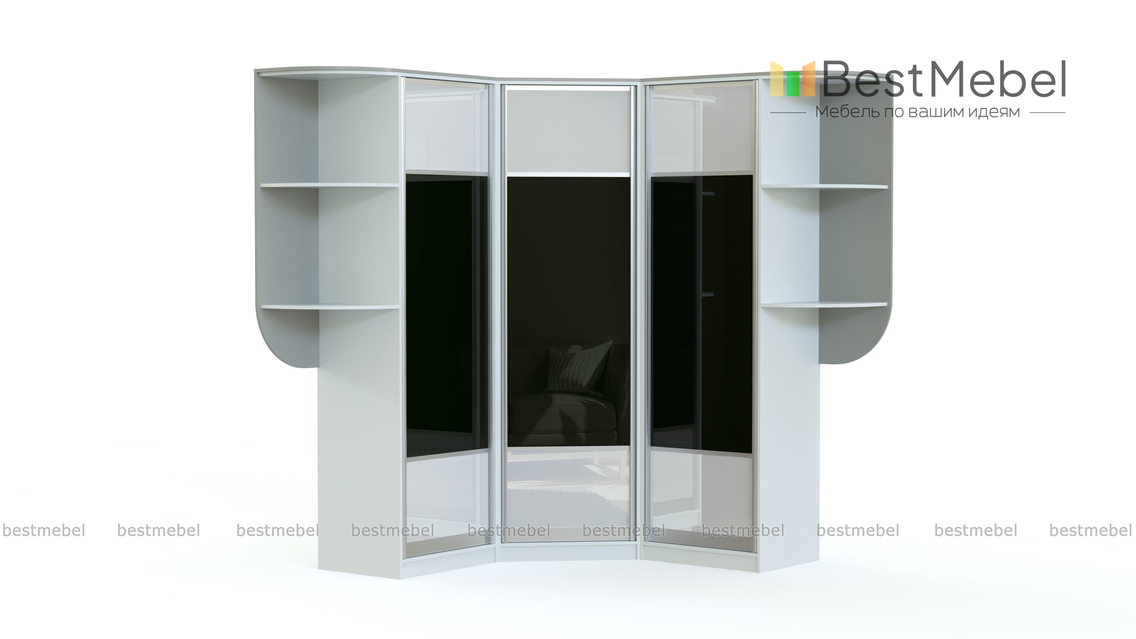 Шкаф угловой Серебро BMS - эффектный и функциональный, будет востребован в гостиных, спальнях или прихожих. Трехстворчатая модель с платяным отделением и полками дополнена стильными скругленными стеллажами для книг, аксессуаров и декора. Контрастные оттенки ламинированной плиты и стекла, покрытого пленкой Оракал, сочетаются с серебристым профилем в отделке. Купить шкаф угловой Серебро BMS вы сможете в нашем интернет-магазине, по желанию изменив размеры, цвет и наполнение.