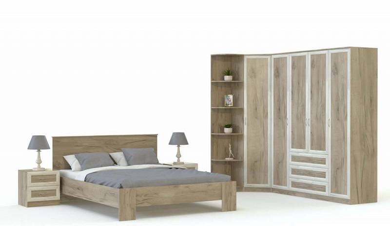Мебель для спальни Волх 2 BMS гармонично впишется в просторные помещения и включает все необходимое для полноценного отдыха и удобного хранения вещей. Выполненные в контрастных древесных тонах, предметы с рамочными фасадами сочетают классические и современные черты. В комплекте просторная двуспальная кровать без спинки в изножье, прикроватные тумбы с выдвижными ящиками и вместительная угловая шкафная группа, дополненная торцевым стеллажом с элегантно скругленными полками. Купить мебель для спальни Волх 2 BMS по выгодной цене приглашаем в наш интернет-магазин.