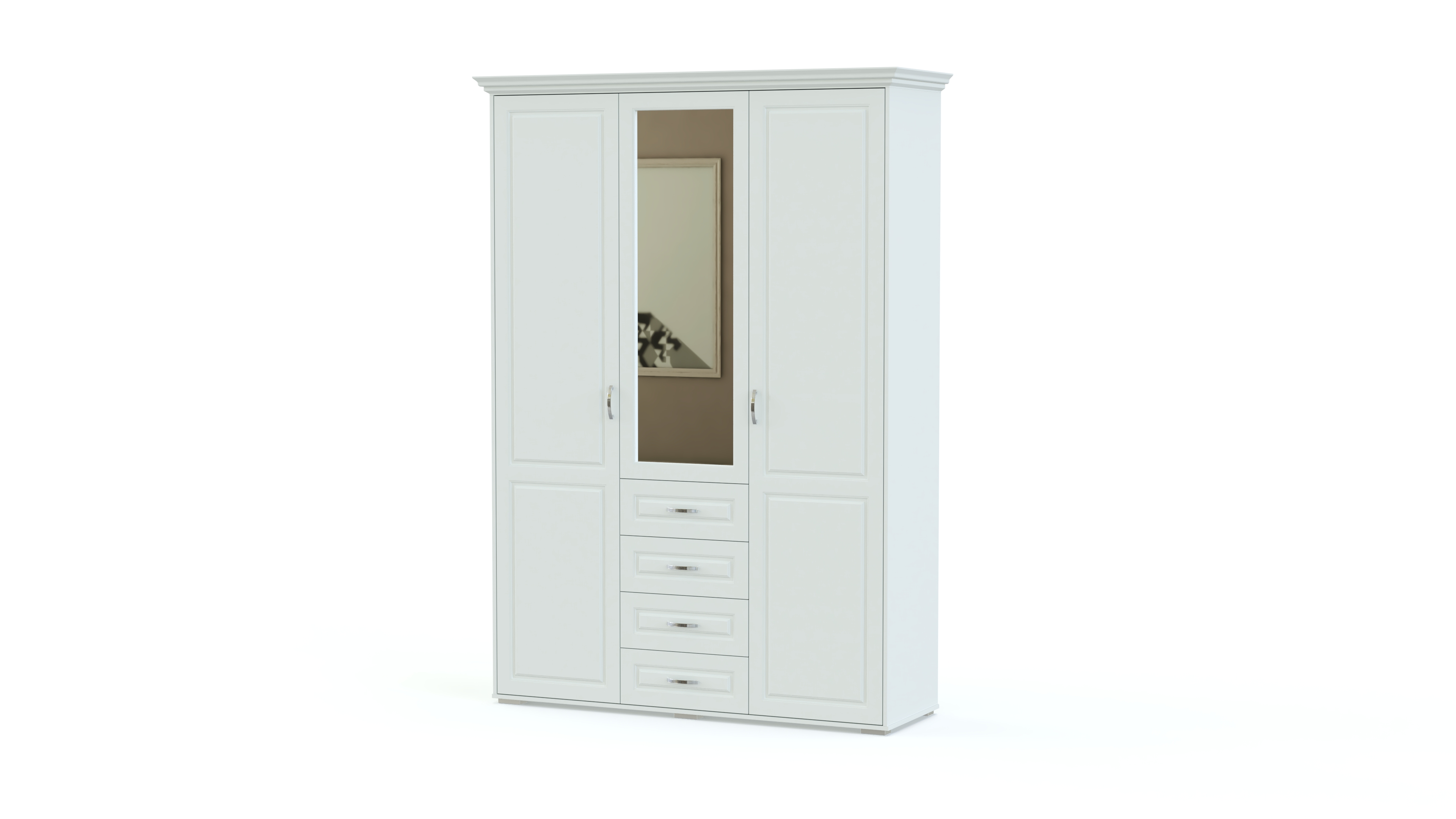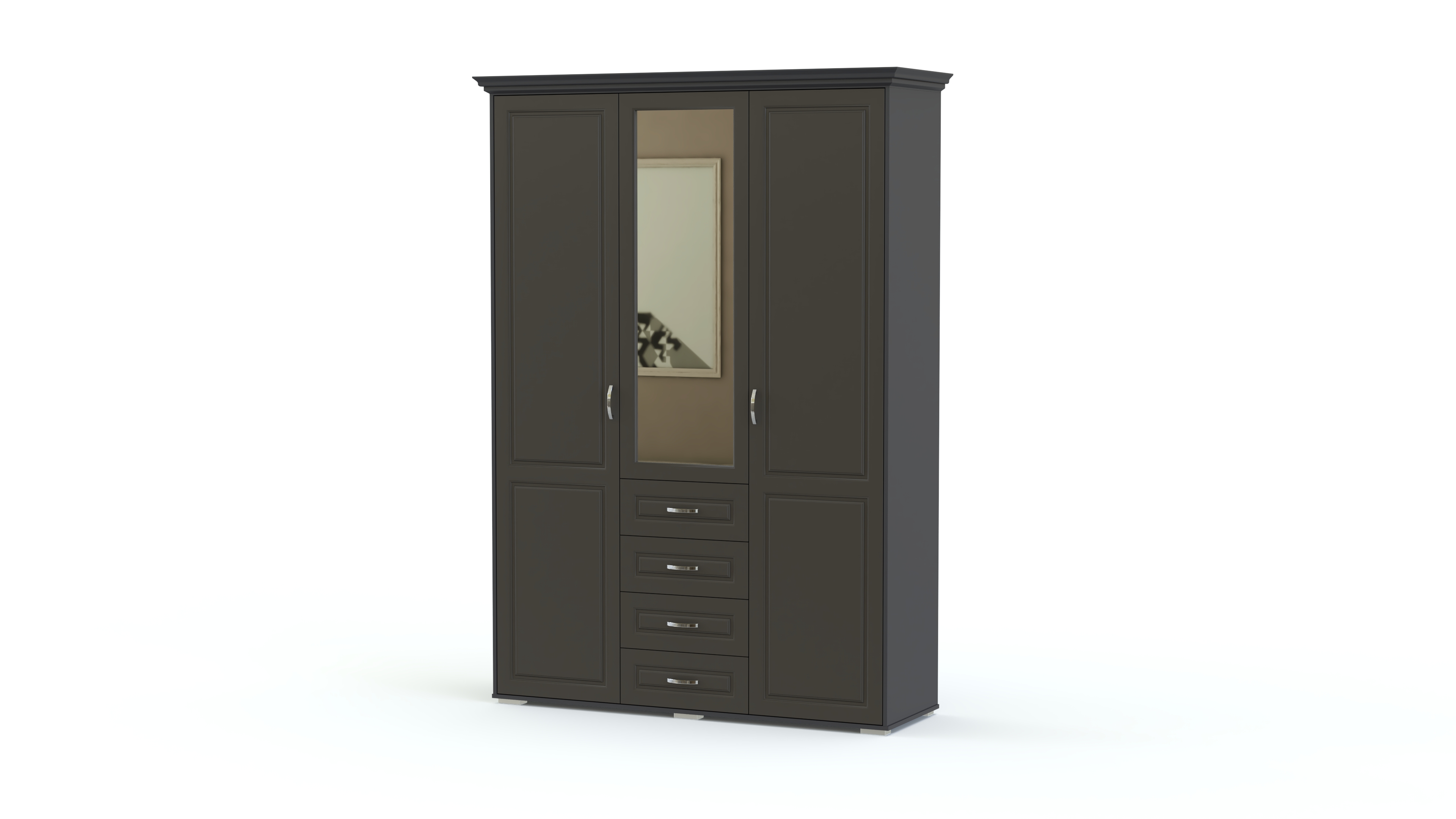 Спальня Мирма 4 BMS станет выбором тех, кто ценит сдержанную элегантность классики. Эффектный гарнитур состоит из кровати, высокая спинка в изголовье которой декорирована экокожей с каретной стяжкой, прикроватных тумб, бельевого комода с зеркалом, а также трехдверного распашного шкафа с выдвижными ящиками для мелочей. Фрезерованные фасады предметов выполняются в благородных древесных тонах. Купить спальню Мирма 4 BMS по лучшей цене вы сможете в нашем интернет-магазине.