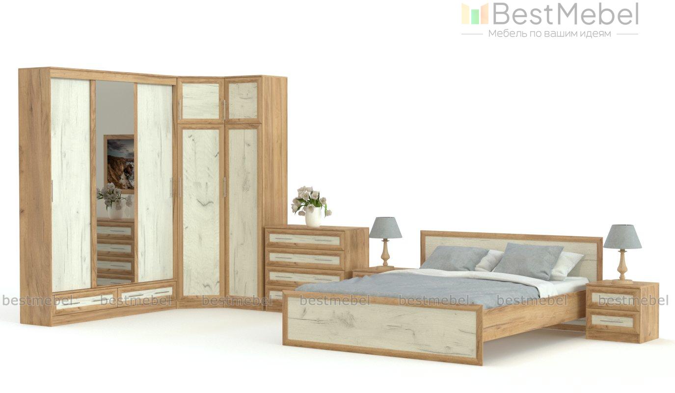 Эта спальня в современном стиле не выглядит громоздко благодаря светлым контрастным фасадам, а вместительный угловой шкаф с зеркалом в полный рост вполне способен заменить собой гардеробную. В комплект также входит просторная кровать с двумя приставными боковыми тумбами и классический комод с четырьмя выдвижными ящиками и широкой столешницей. Спальня Модерн Композиция 2 BMS отличается спокойными универсальными цветами отделки, стильной фурнитурой и радует доступной ценой.