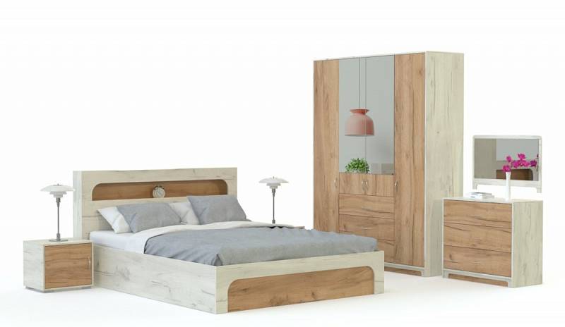 Оригинальное дизайнерское решение этой современной спальни не оставит равнодушными тех, кто ценит не только функциональность, но стильный вид мебели. В комплекте шкаф для одежды и белья с зеркалом и выдвижными ящиками, комод с зеркалом навесным, кровать и прикроватная тумба. Необычно оформление фасадов и корпуса в расцветке под массив со светлой окантовкой и скругленными краями. Дополняют стильный образ спальни Терра Люкс BMS эргономичные врезные ручки.