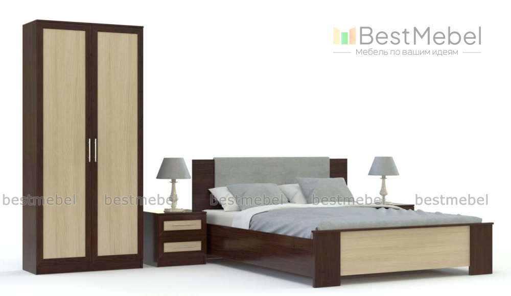 Спальня Дженна BMS выполнена в оригинальном стиле, сочетающем строгую классику и минимализм. В нее вошли предметы, необходимые для обустройства функциональной и уютной спальни. Кровать имеет высокое изголовье, обитое красивой тканью и две прикроватные тумбочки, на которых хорошо разместить светильники, положить недочитанную книгу, очки, телефон. Двустворчатый шкаф позволит удобно разместить одежду и разные домашние вещи. Для цветового оформления комплекта использованы два цвета — темный насыщенный дуба феррара и свело-бежевый, что создает приятное впечатление, делает комнату светлее и просторнее. Купить модную спальню Дженна BMS по самой выгодной цене, с бесплатной доставкой можно в нашем магазине онлайн.