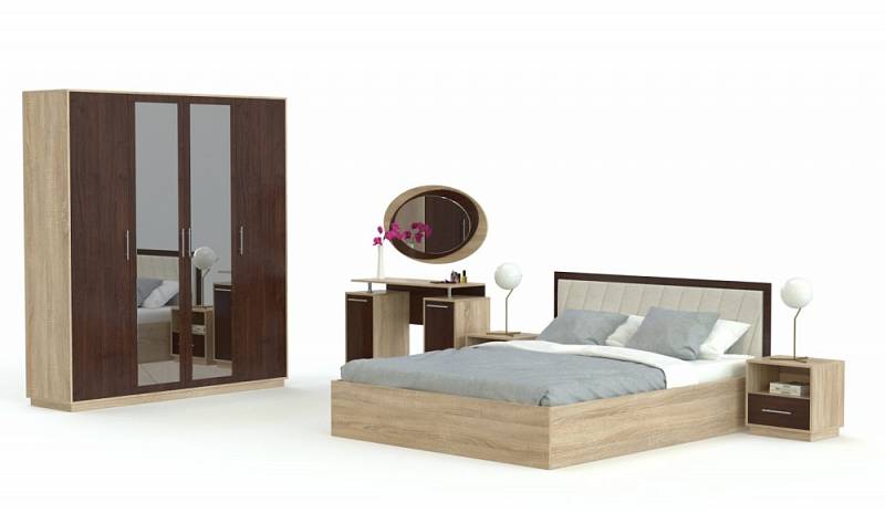 Спальный гарнитур Эстер 1 BMS – это эффектный дизайн в неоклассическом стиле и комфортное цветовое решение в коричнево-бежевой гамме. Модульная композиция включает в себя двуспальную кровать с высоким изголовьем, декорированным вставкой в экокоже, прикроватные тумбы с ящиками и нишами и четырехдверный распашной шкаф для белья и одежды с зеркальными створками в центральной части. Купить спальный гарнитур Эстер 1 BMS и создать запоминающийся интерьер вам поможет наш интернет-магазин.