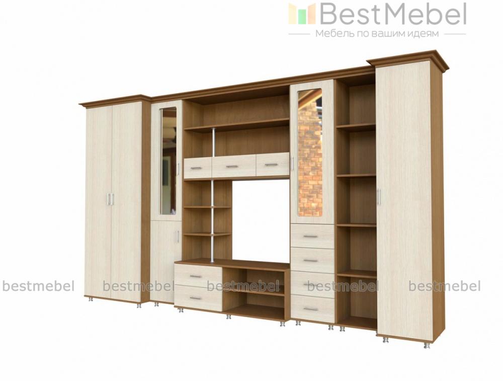 Стенка Дебют 1 BMS – крупногабаритная конструкция в духе современной классики, объединившая отделения разного типа для максимально удобного размещения вещей. Модель выполнена в контрастном сочетании древесных тонов и декорирована традиционным карнизом и хромированными элементами. В комплект входят распашной шкаф для одежды, пенал, комбинированные узкие шкафчики с зеркалами, стеллажи и низкая тумба под ТВ. Износостойкие поверхности надолго сохранят эстетичный вид и стенка будет радовать хозяев и гостей дома. Купить стенку Дебют 1 BMS, подобрав необходимые параметры, приглашаем в наш интернет-магазин.